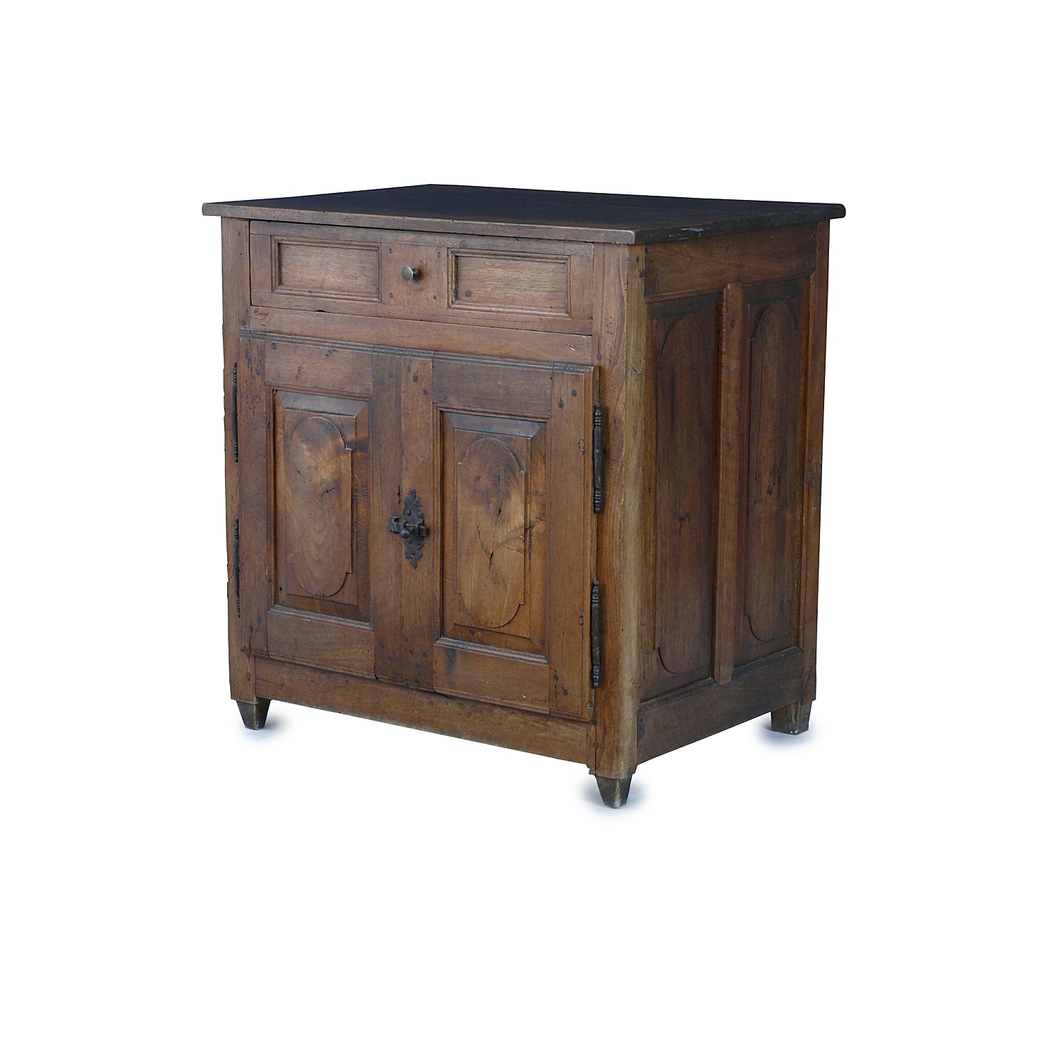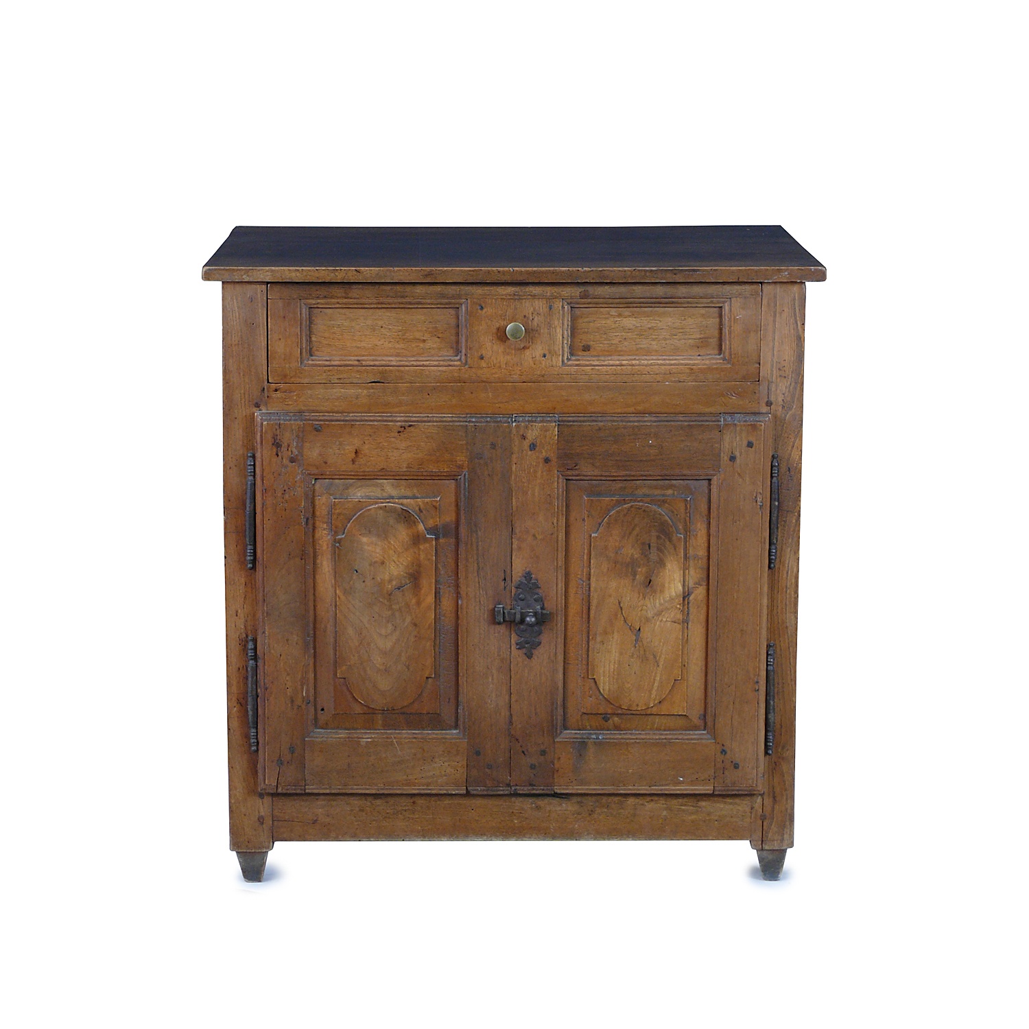 FRENCH WALNUT SMALL CUPBOARD TWO PANELLED DOORS AND A SINGLE DRAWER CIRCA 1680 73 CM HIGH 69 CM WIDE 49 CM DEEP