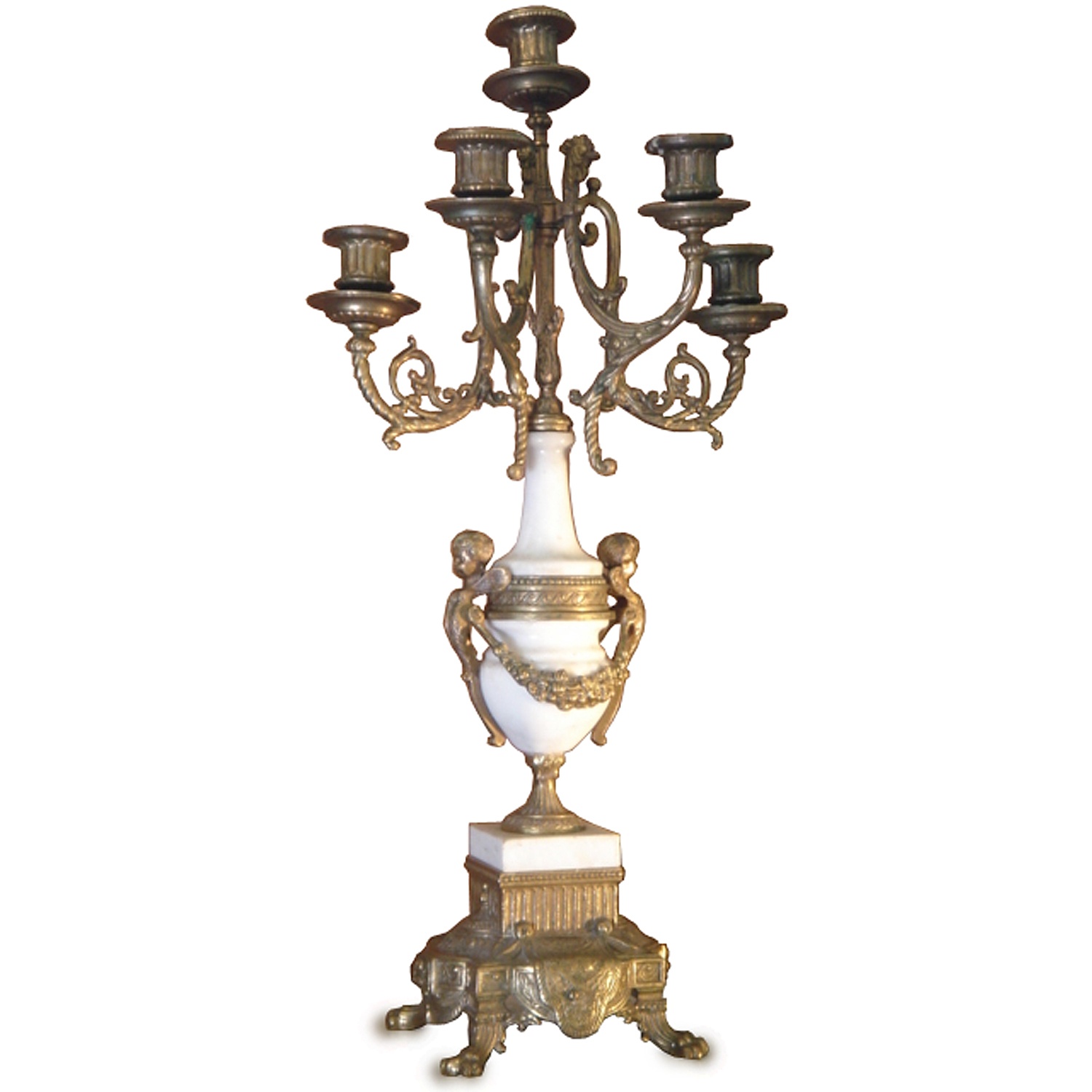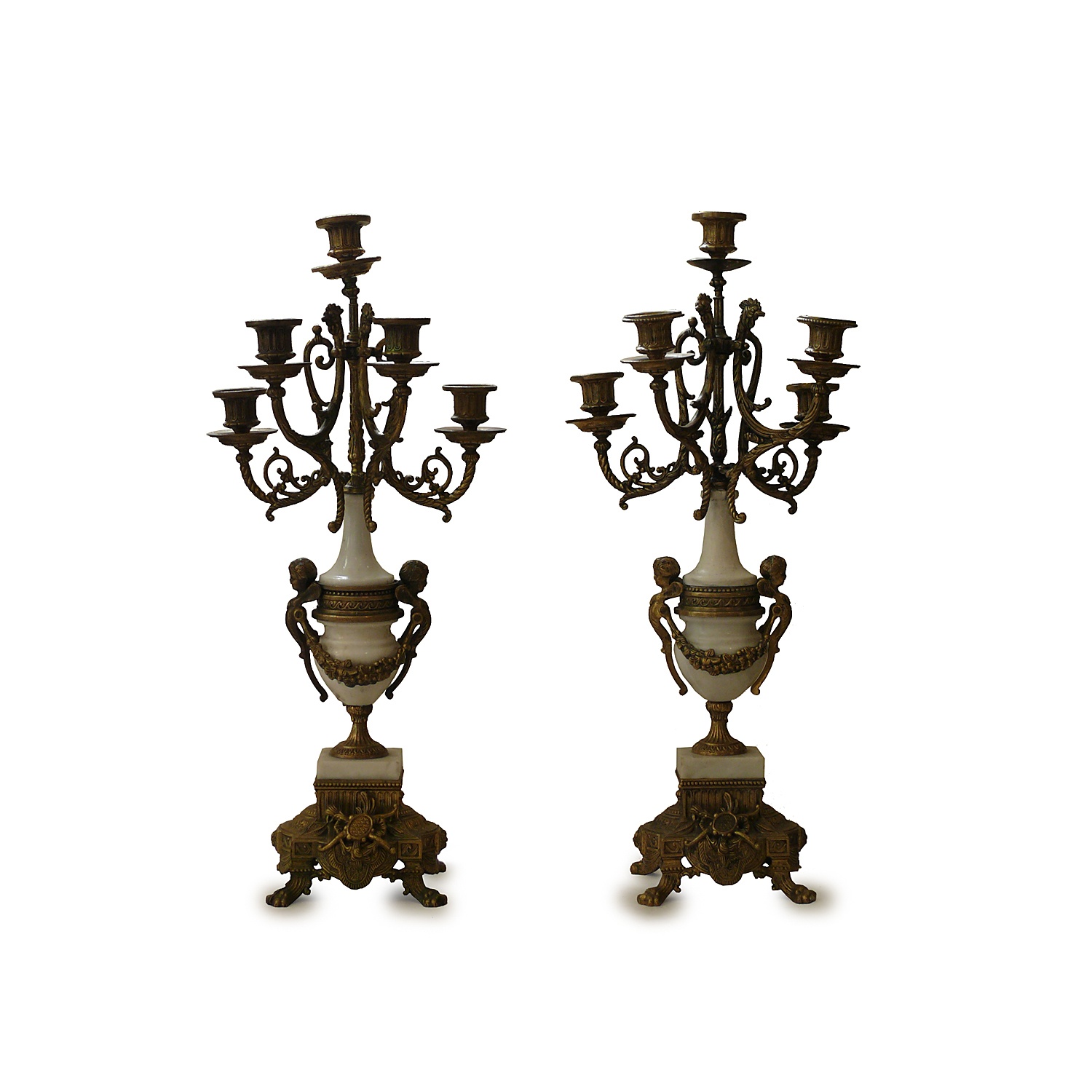 FRENCH WHITE CHINA AND BRASS CHERUB CANDELABRA 60 CM HIGH 26 CM WIDE (X4)