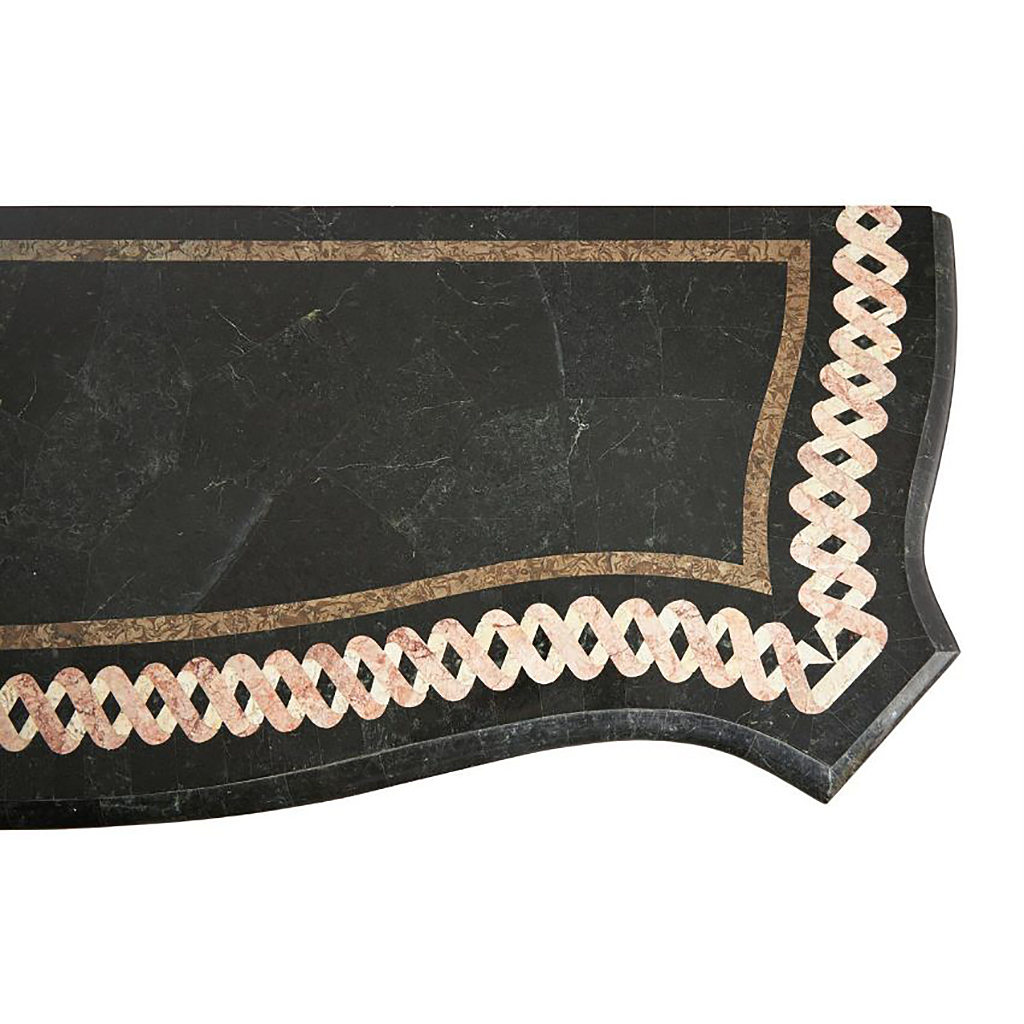 FRENCH WROUGHT IRON AND GILT METAL MOUNTED CONSOLE TABLE WITH A SERPENTINE BLACK MARBLE RIBBON PATERNED INLAID TOP 20TH CENTURY 82 CM HIGH 137 CM WIDE 44 CM DEEP
