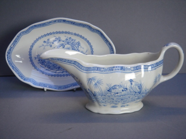 FURNIVALS QUAIL SAUCE BOAT AND STAND BLUE AND WHITE (X3)