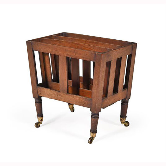 GEORGE IV MAHOGANY CANTERBURY MAGAZINE RACK TAPERING SIDES ON TURNED LEGS WITH BRASS CASTORS CIRCA 1825 50 CM HIGH 53 CM WIDE 31 CM DEEP