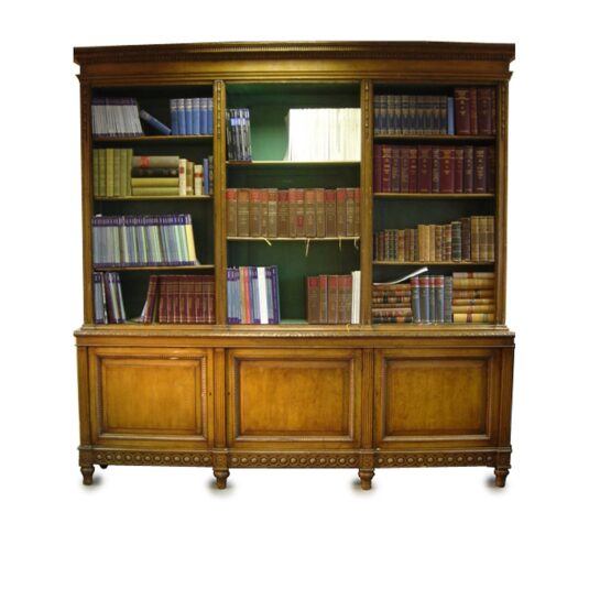 GEORGIAN BOOKCASE LIGHT OAK AND PINE WITH THREE SECTIONS OF OPEN SHELVES ABOVE THREE CUPBOARDS 7'9/i HIGH X 7'5/i WIDE