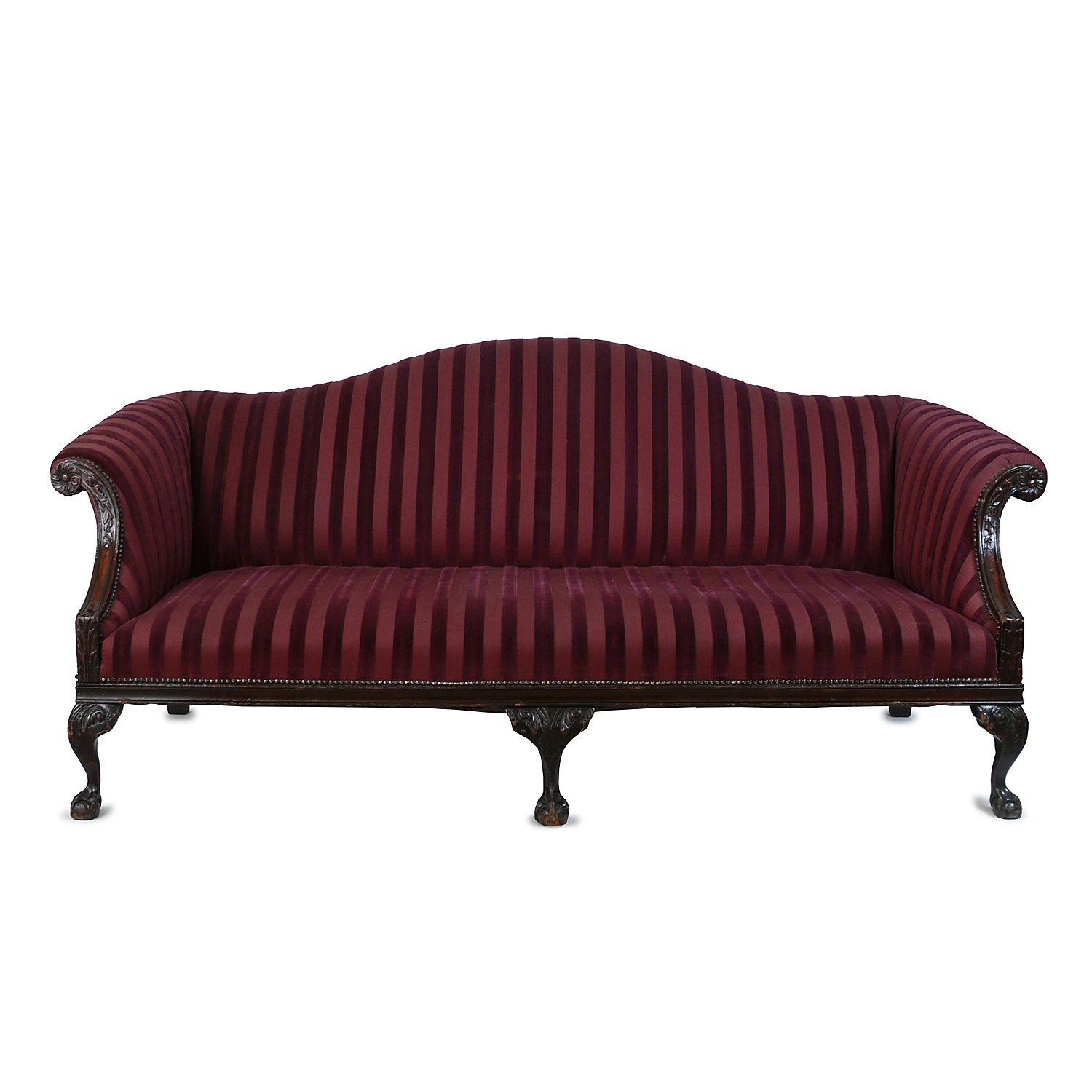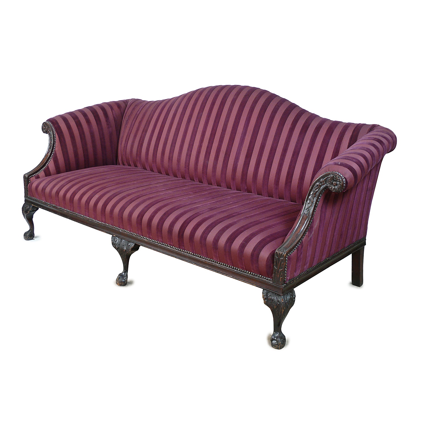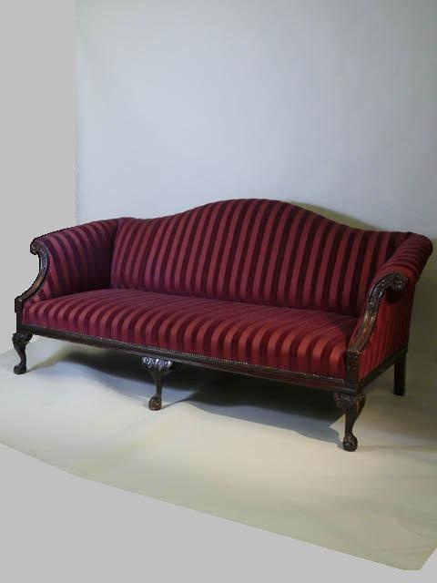 GEORGIAN CAMEL BACK THREE SEAT SETTEE / SOFA CABRIOLE LEGS BURGUNDY STRIPED CUT VELVET UPHOLSTERY 208 CM LONG