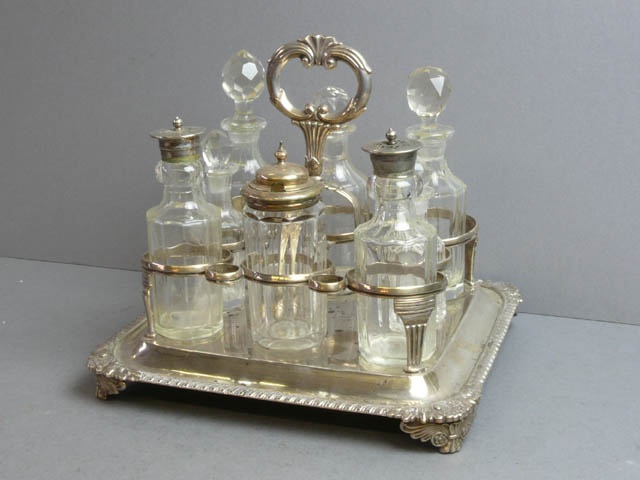 GEORGIAN CRUET SET E.P. SILVER GADROON EDGE WITH EIGHT CUT GLASS BOTTLES