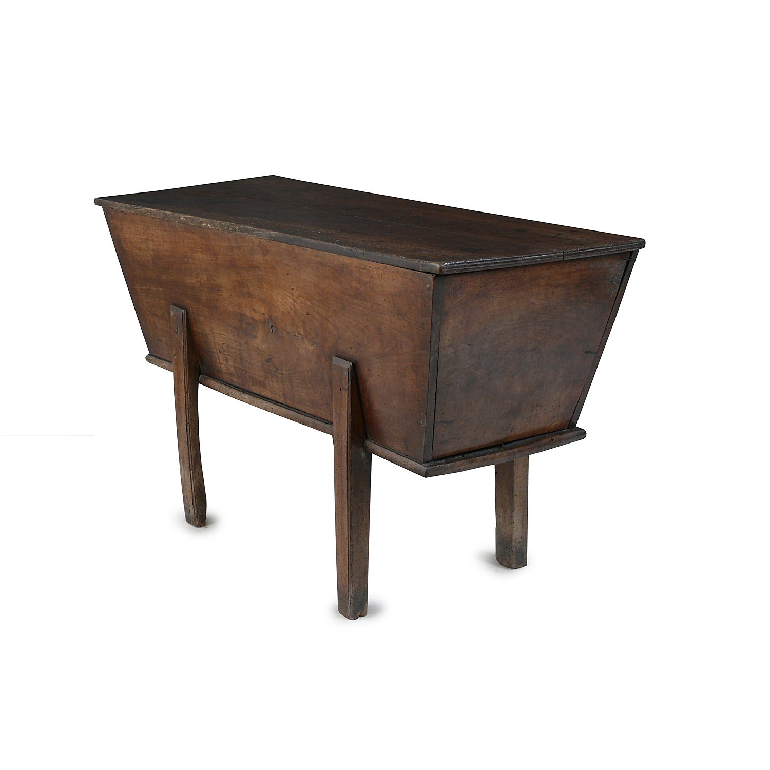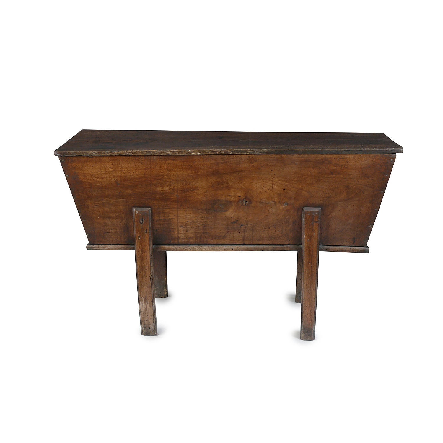 GEORGIAN ELM DOUGH BIN CIRCA 1750 REMOVABLE PLANK LID ABOVE A SPLAYED BOX ON SQUARE LEGS (GIPPING FARM STOWMARKET) 65 CM HIGH 112 CM LONG 45 CM DEEP