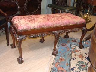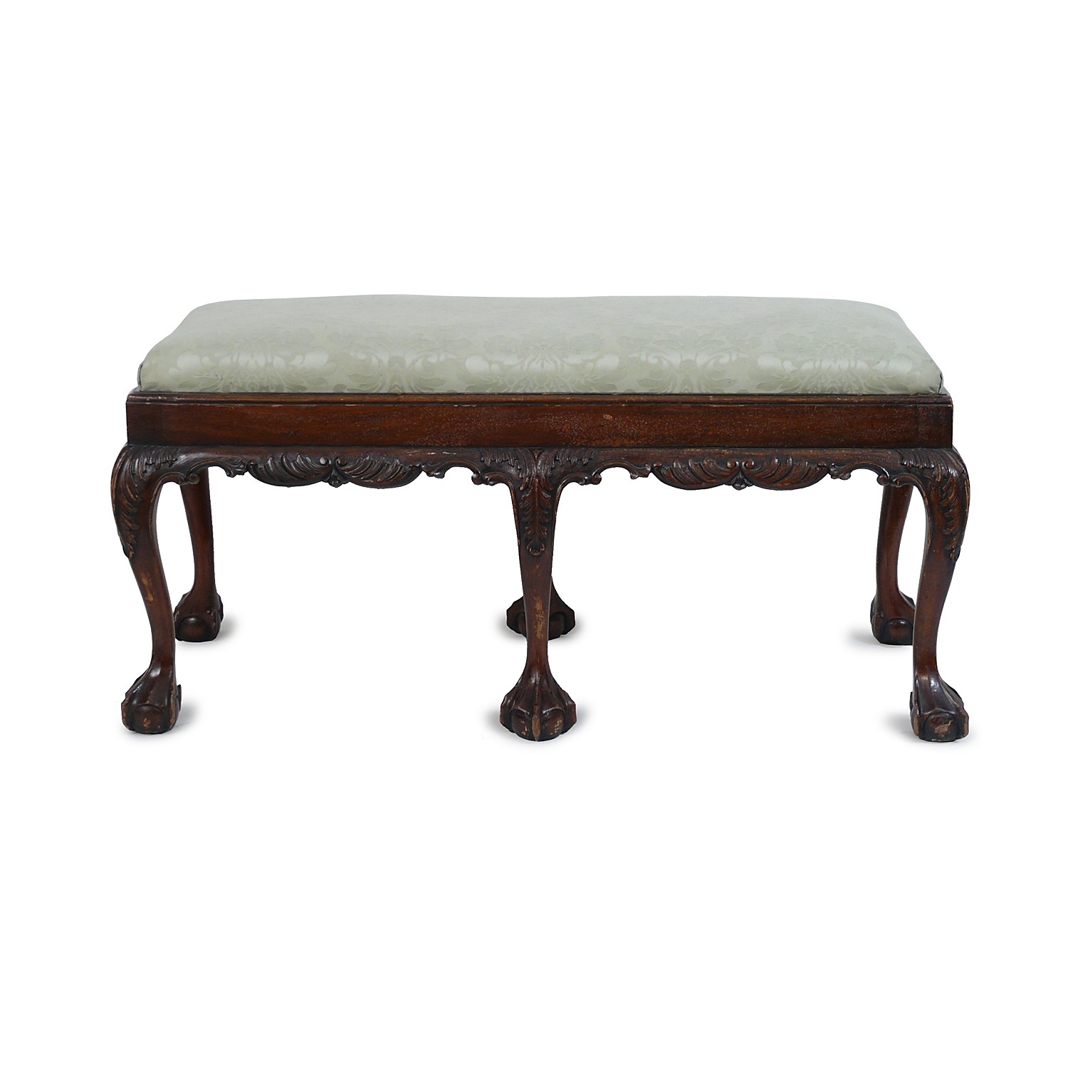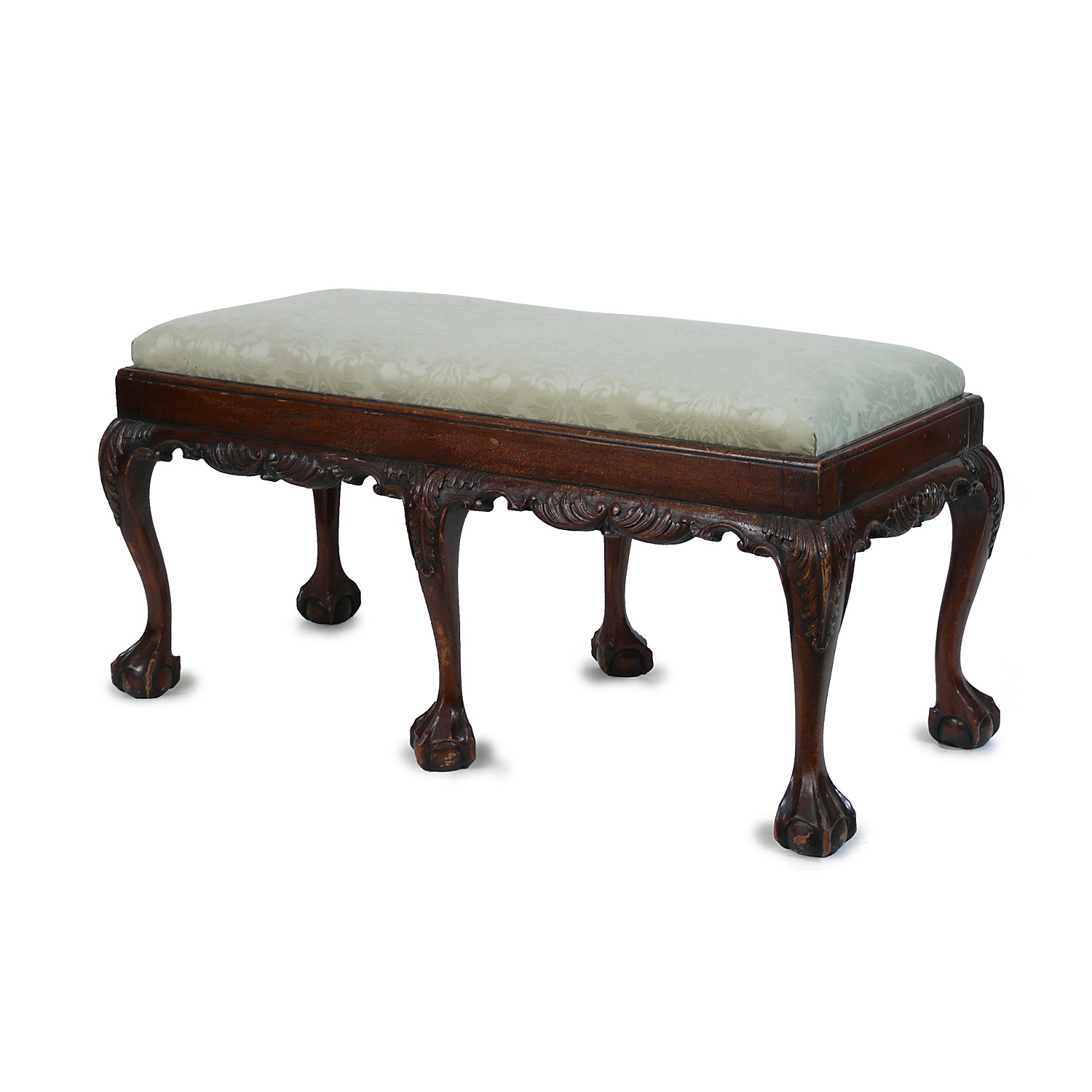 GEORGIAN STYLE DUET STOOL CARVED MAHOGANY SIX LEG WITH PALE GREEN DAMASK UPHOLSTERY