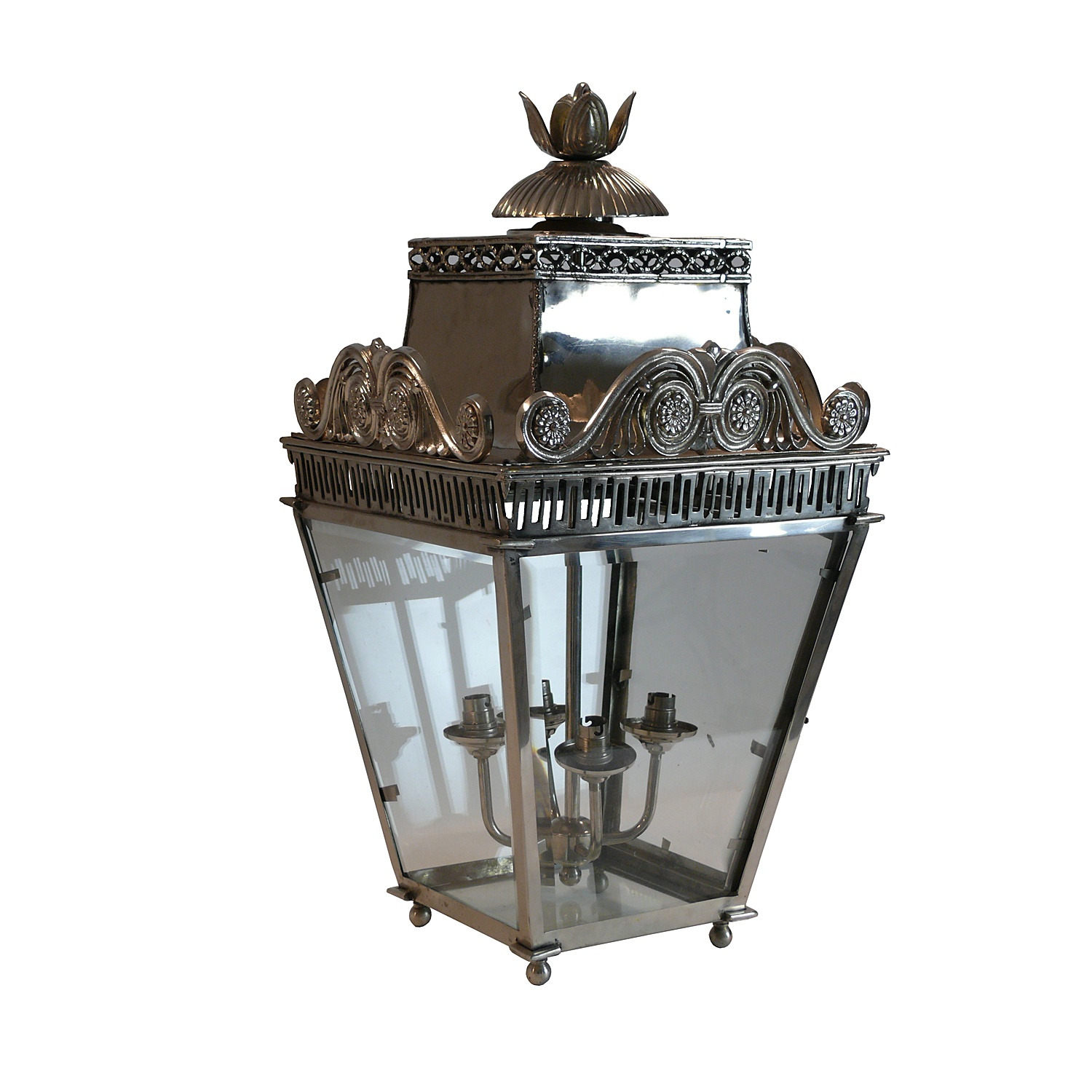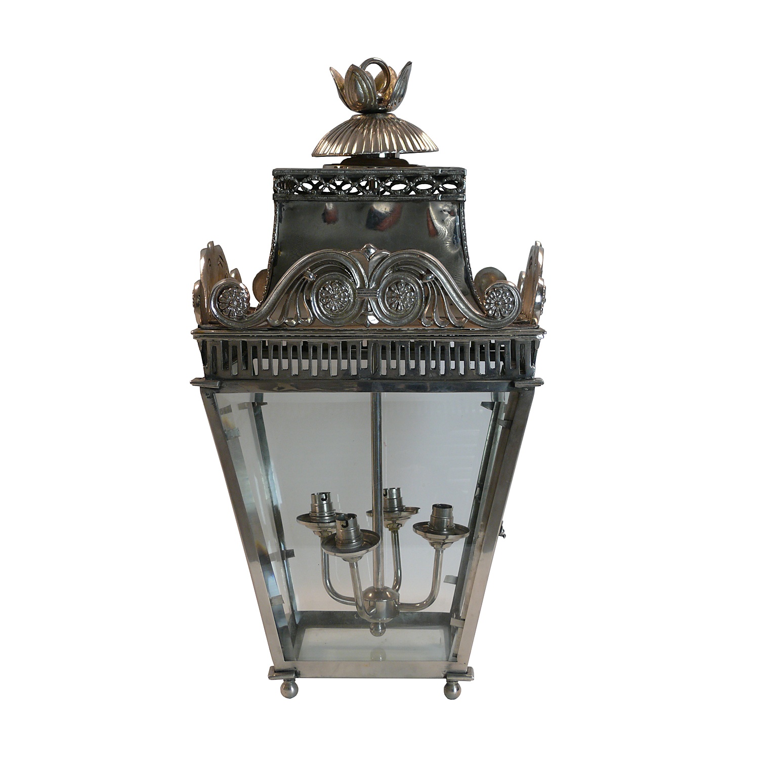 GEORGIAN STYLE HALL LANTERN WITH ACANTUS SCROLL TOP SILVER PLATED 70 CM HIGH 35 CM WIDE