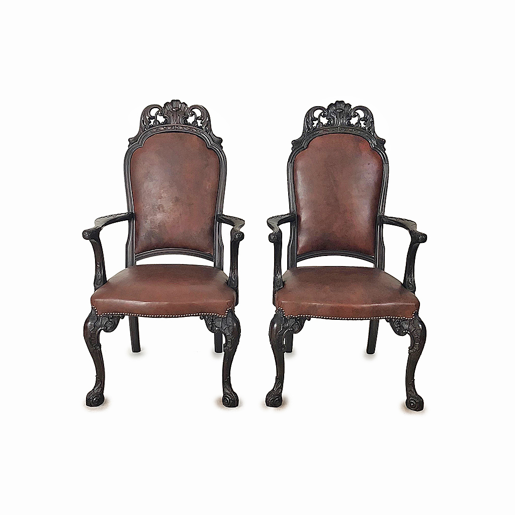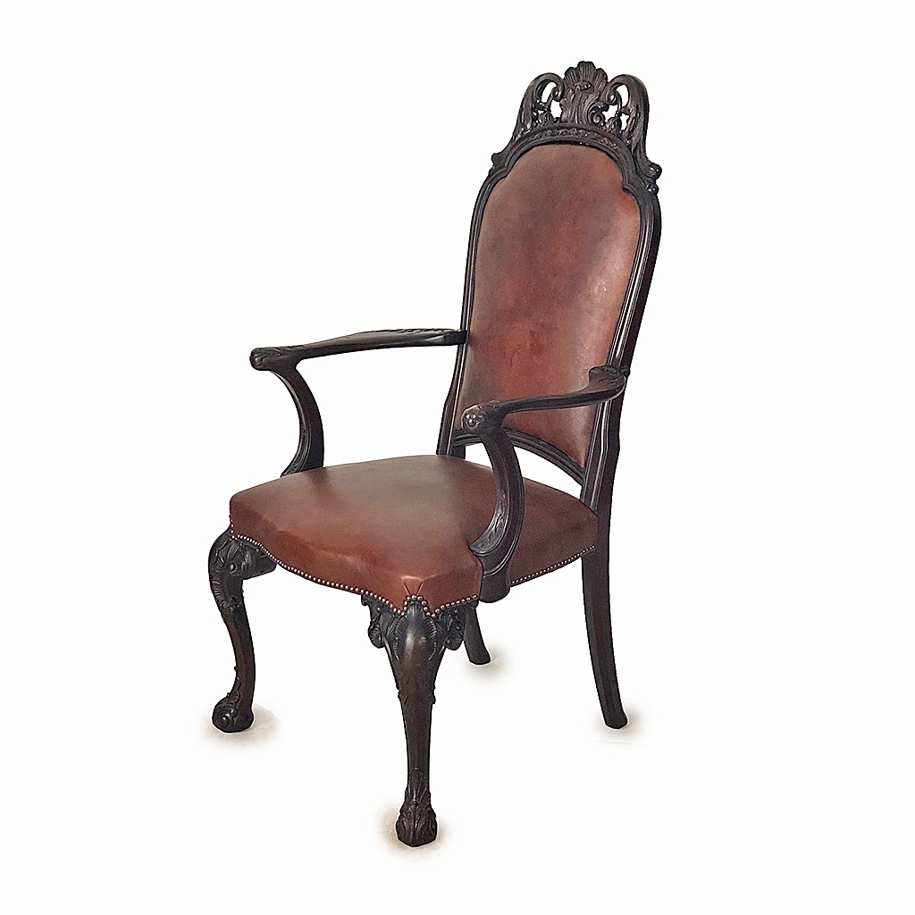 GEORGIAN STYLE HIGH BACK ARMCHAIR CARVED MAHOGANY WITH BROWN LEATHER UPHOLSTERY 121 CM HIGH 63 CM WIDE 60 CM DEEP (X2)