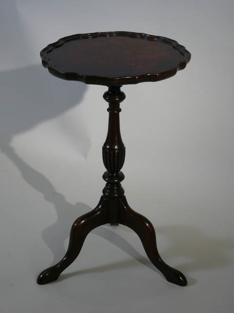 GEORGIAN STYLE TEA / WINE TABLE CIRCULAR WALNUT TOP PIE CRUST EDGE ON MAHOGANY PEDESTAL BASE 51 CM HIGH 32 CM DIAM