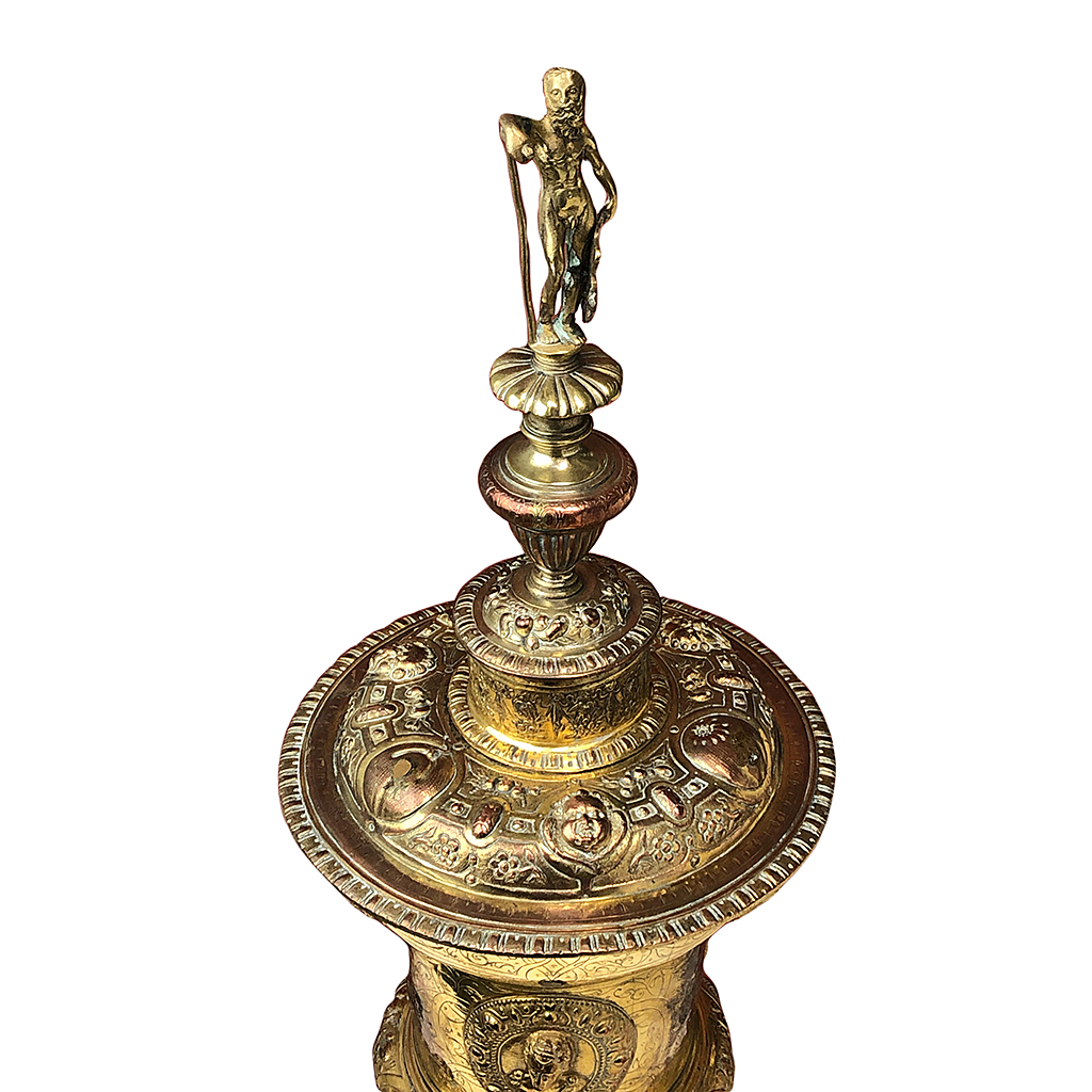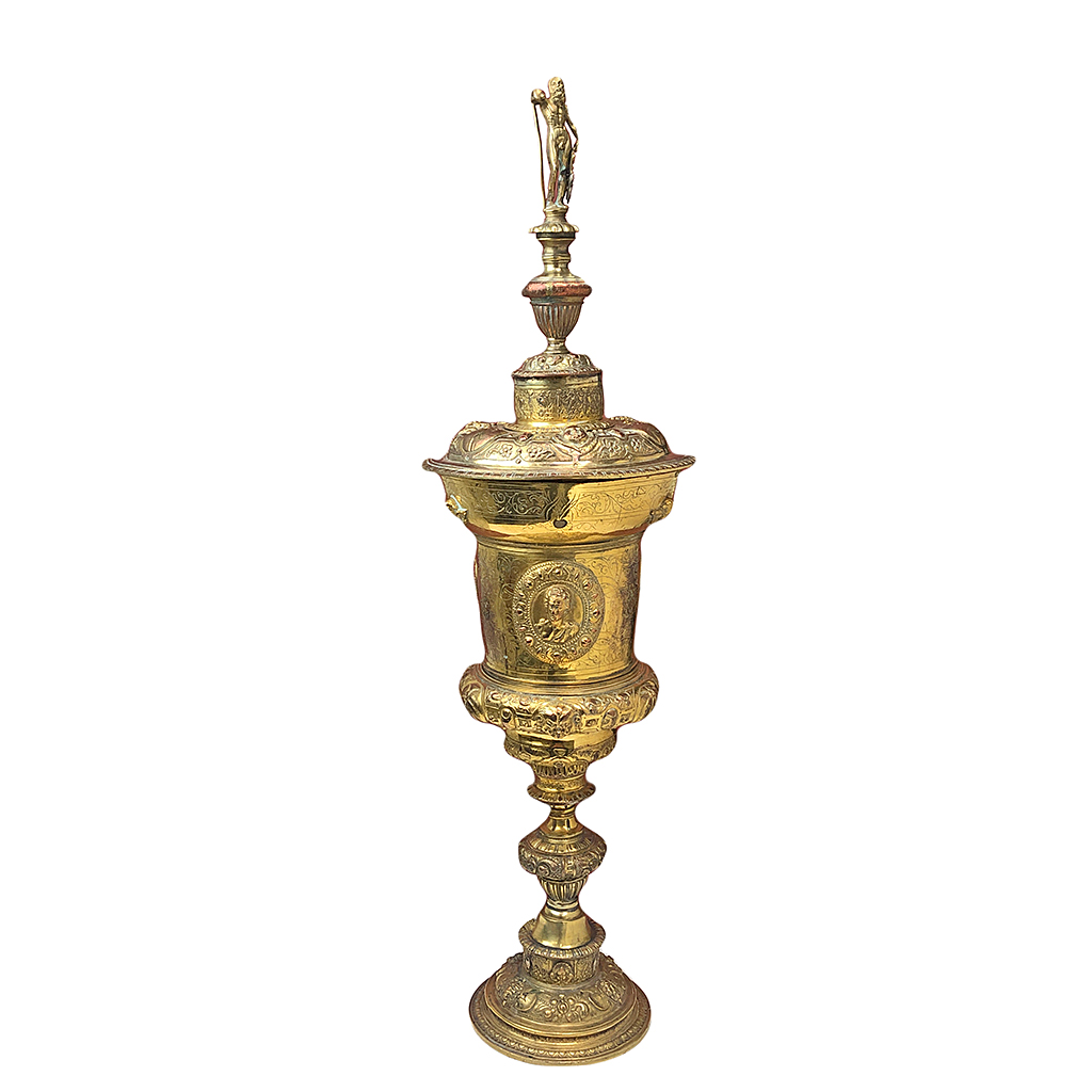 GERMAN RENAISSANCE STYLE CHALICE / CUP AND COVER SILVER GILT WITH MEDALLION CENTRE AND STATUE TO LID 57 CM HIGH 17 CM DIAM