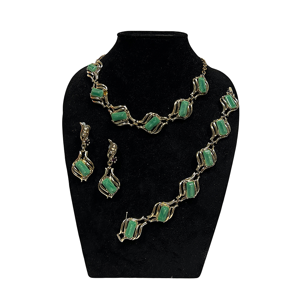 GILT AND GREEN PLASTIC SET NECKLACE BRACELET AND DROP EARRINGS
