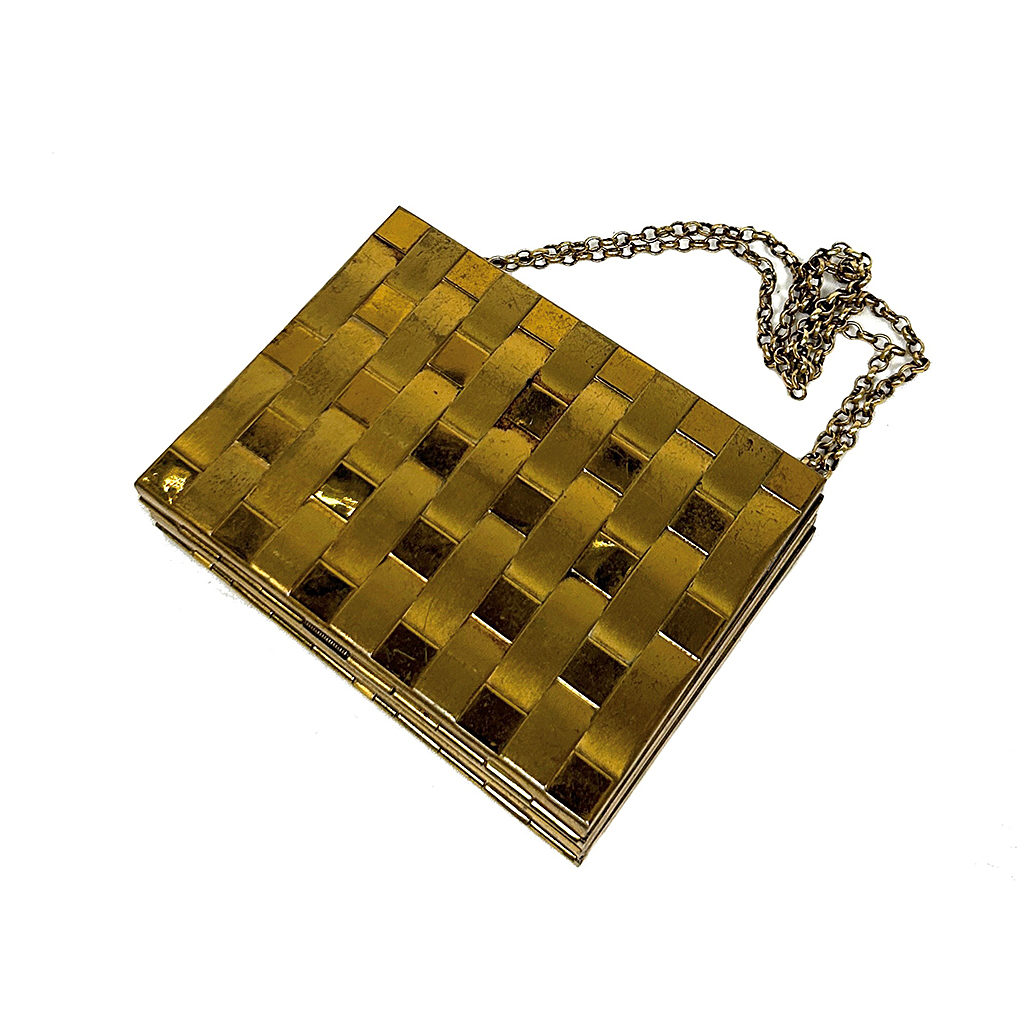GILT COMPACT / CIGARETTE CASE CHAIN BAG BASCET WEAVE DECORATION 10 CM X 8 CM