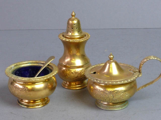 GILT FLOWER ENGRAVED 3 PIECE CONDIMENT SET : PEPPER POT 11 CM HIGH / OPEN SALT WITH SPOON AND BLUE LINER / COVERED MUSTARD POT WITH SPOON AND BLUE LINER