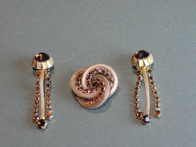 GILT MESH BROOCH WITH BROWN PASTE AND MATCHING DROP EARRINGS
