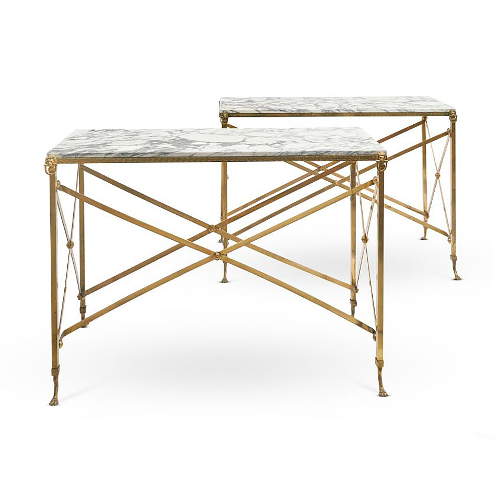 GILT METAL RECTANGULAR CONSOLE TABLE IN CAMPAIGN STYLE WITH WHITE MONTROUSSE MARBLE TOP ATTRIBUTED TO ERAIIS, POSSIBLY SPANISH, CIRCA 1950 84 CM HIGH 120 CM LONG 46.5 CM DEEP (X2)