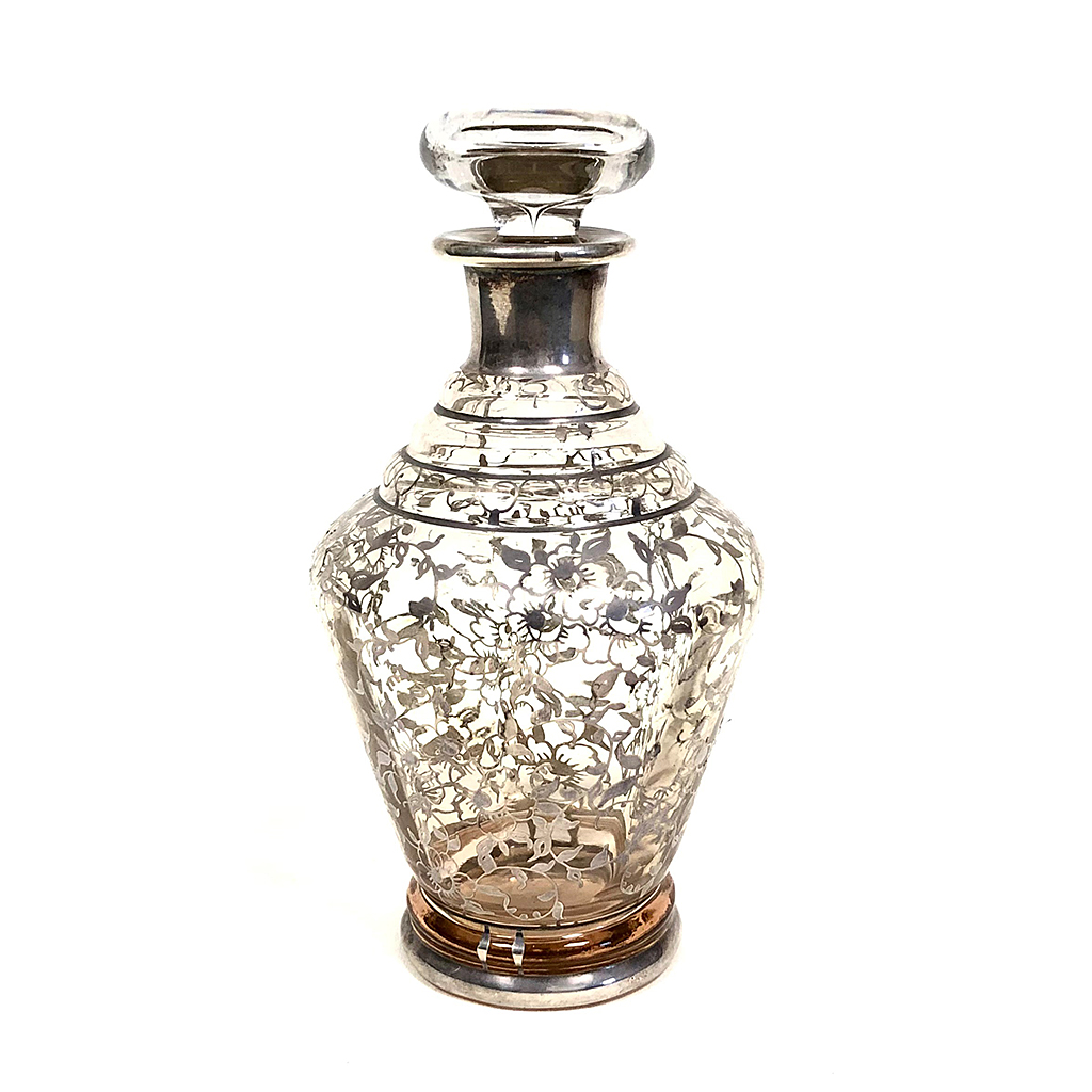 GLASS FLASK DECANTER WITH SILVER DEPOSIT PATTERN AND STOPPER 19 CM TALL