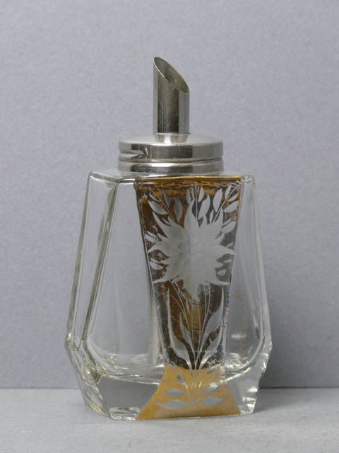 GLASS SUGAR POUREER WITH GOLD FLORAL DESIGN 13 CM HIGH