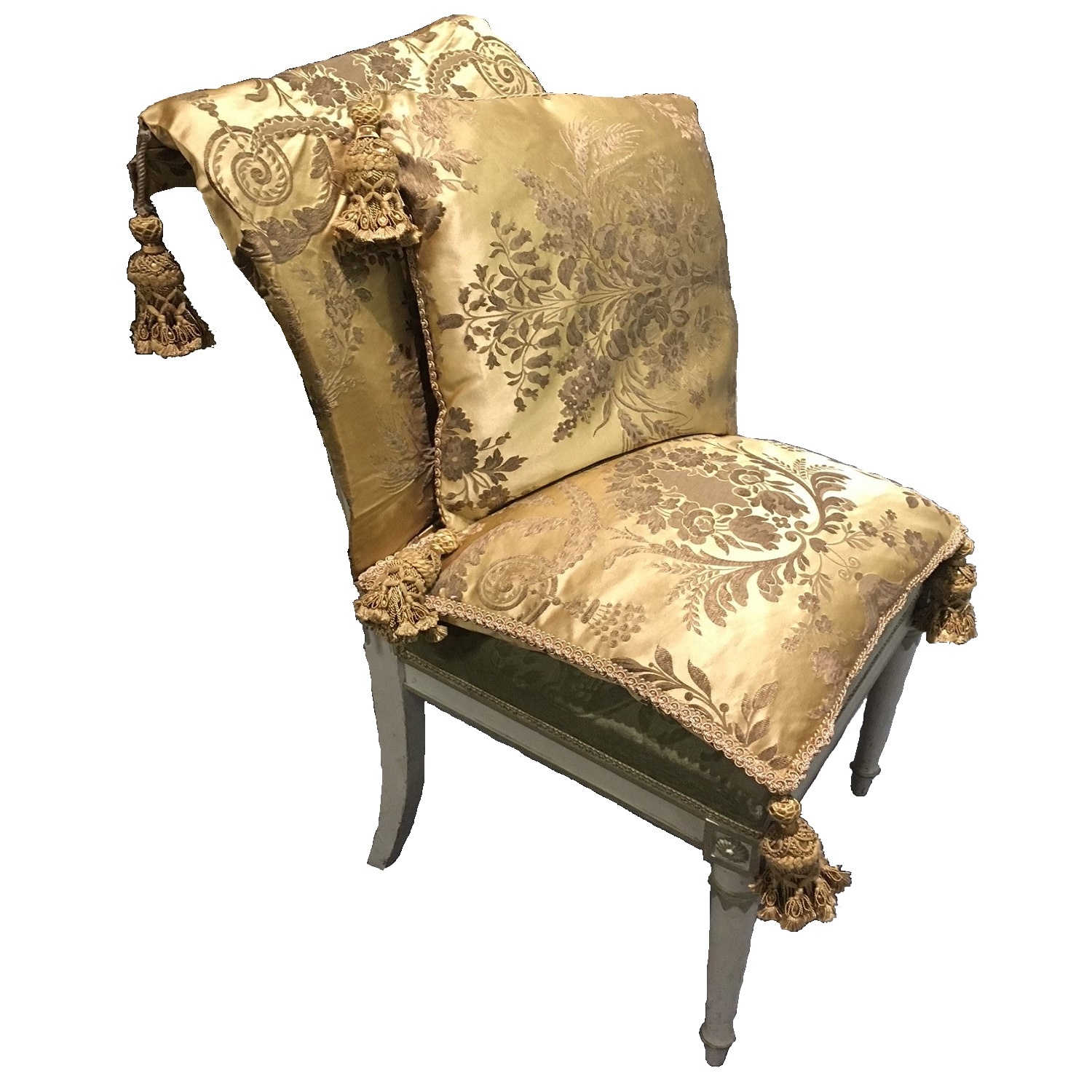 GOLD DAMASK CHAIR COVER WITH BUILT IN SEAT CUSHION PLUS MATCHING SEPERATE CUSHION BOTH WITH ELABORATE CORNER TASSELS