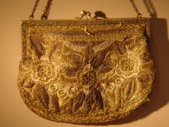 GOLD EMROIDERED HANDBAG WITH GILT METAL TOP AND CHAIN STRAP 18 CM WIDE