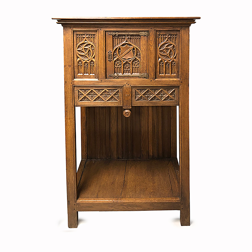 GOTHIC COURT CUPBOARD CARVED LIGHT OAK WITH SMALL CENTRAL DOOR LINEN FOLD BACK 16TH CENT STYLE H 150 CM D 46 CM W 93 CM (X2)