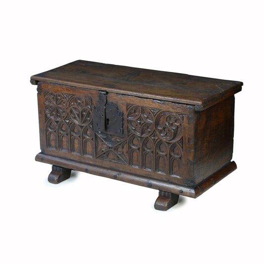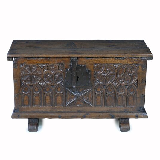 GOTHIC STYLE WALNUT COFFER / BOX PLANK TOP WITH STRAP HINGES CARVED TRACERY TO FRONT 16TH CENT 48 CM HIGH 89 CM WIDE 41 CM DEEP