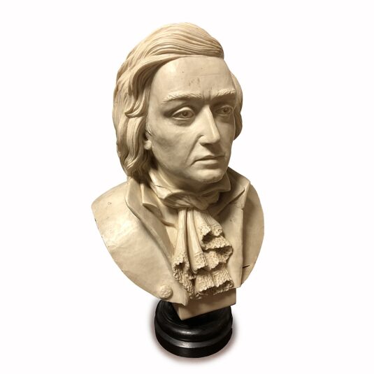 HALF LIFE SIZE BUST OF COMPOSER MOZART ON A BLACK SOCLE BASE