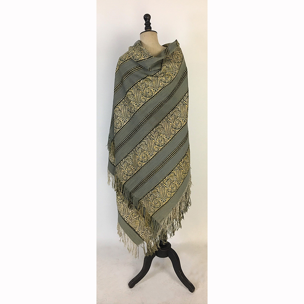 HEAVY PALE BLUE STRIPED WOOL SHAWL WITH BEIGE/GOLD BROCADE STRIPES AND FRINGING