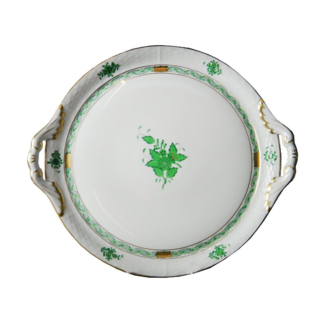 HEREND CIRCULAR PLATTER WITH TWIN HANDLES WHITE CHINA WITH GREEN PATTERN 12" 29 CM (X2)