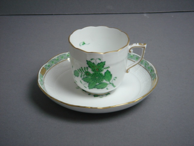 HEREND COFFEE CUP AND SAUCER WHITE CHINA WITH GREEN PATTERN (X31)