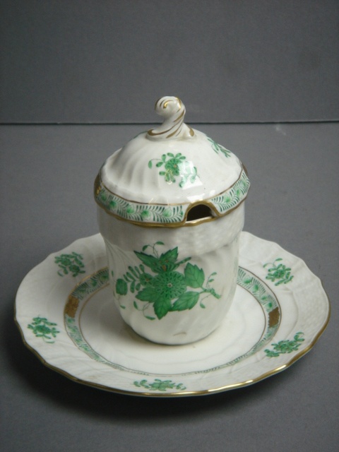 HEREND HONEY POT AND LID FIXED SAUCER WHITE CHINA WITH GREEN PATTERN (X2)