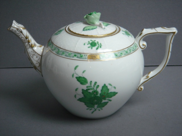 HEREND LARGE TEAPOT AND LID WHITE CHINA WITH GREEN PATTERN (X2)