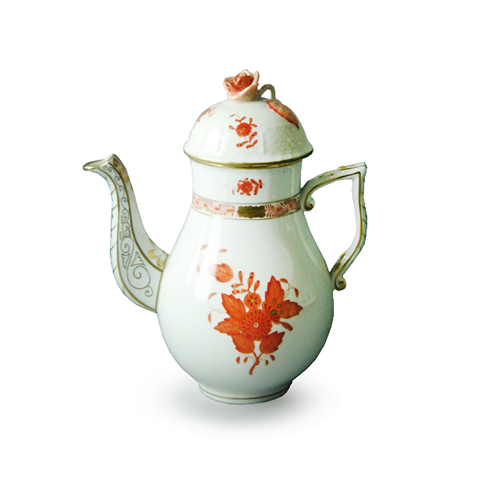 HEREND SMALL COFFEE POT AND LID WHITE CHINA WITH ORANGE DECORATION