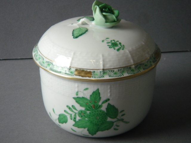 HEREND SUGAR BOX AND LID WHITE CHINA WITH GREEN PATTERN (X2)