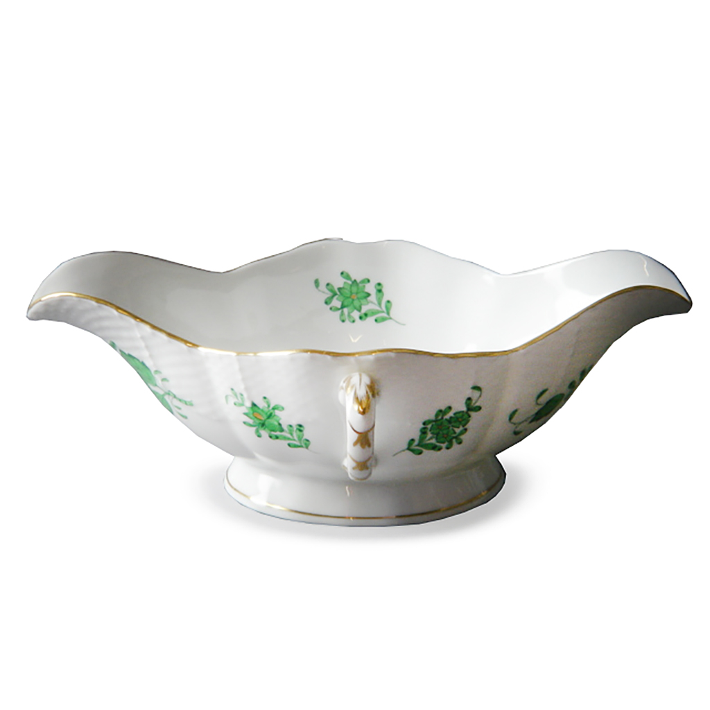 HEREND TWIN HANDLE DOUBLE ENDED SAUCE BOAT WHITE CHINA WITH GREEN PATTERN