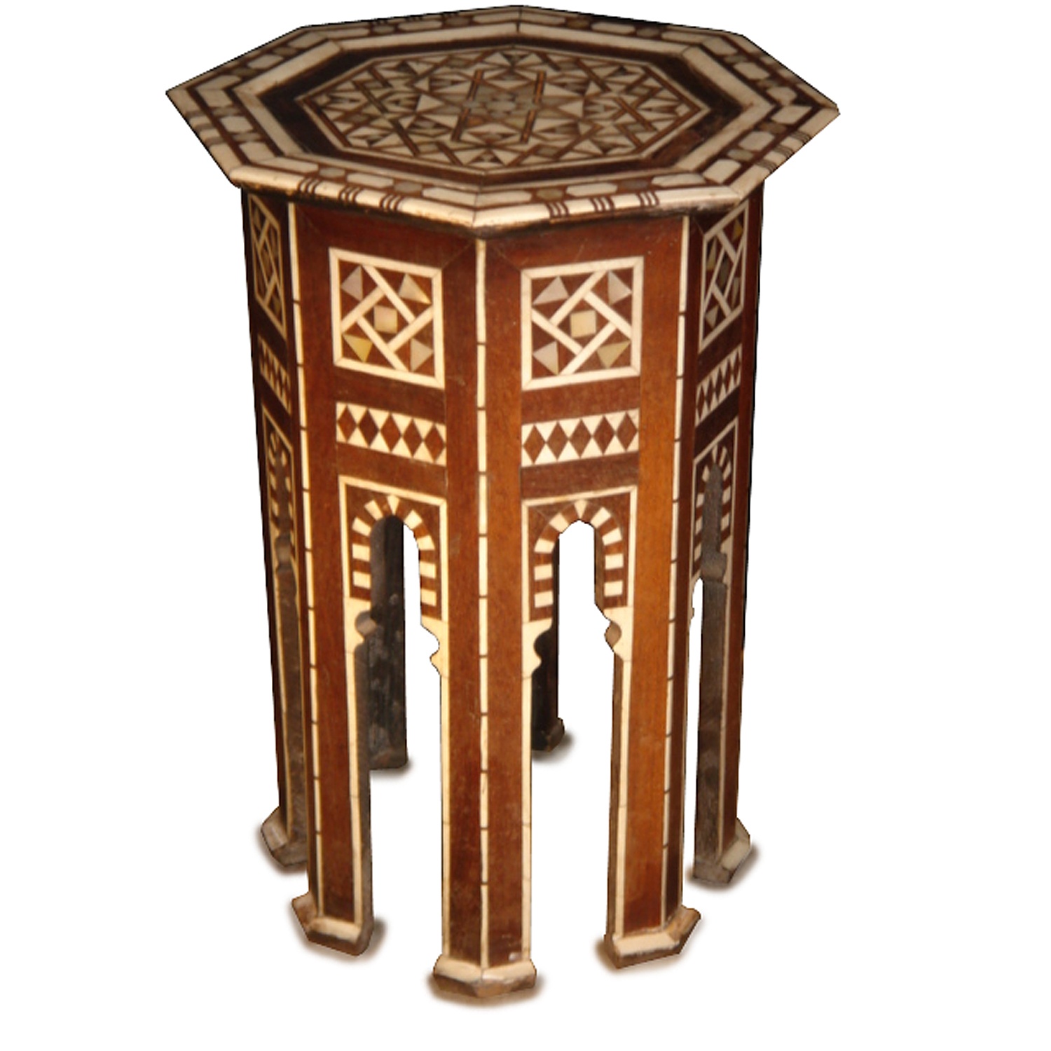 HEXAGONAL BONE INLAID LOW MOROCCAN TABLE LATE 19TH CENT 51 CM HIGH 36 CM WIDE 36 CM DEEP
