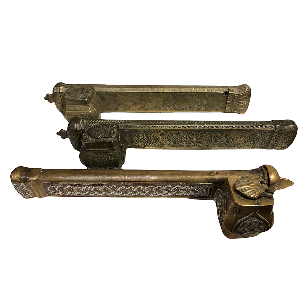 INDIAN BRASS SCRIBES TRAVELLING INKWELL AND PEN HOLDER 24 CM LONG (X3)