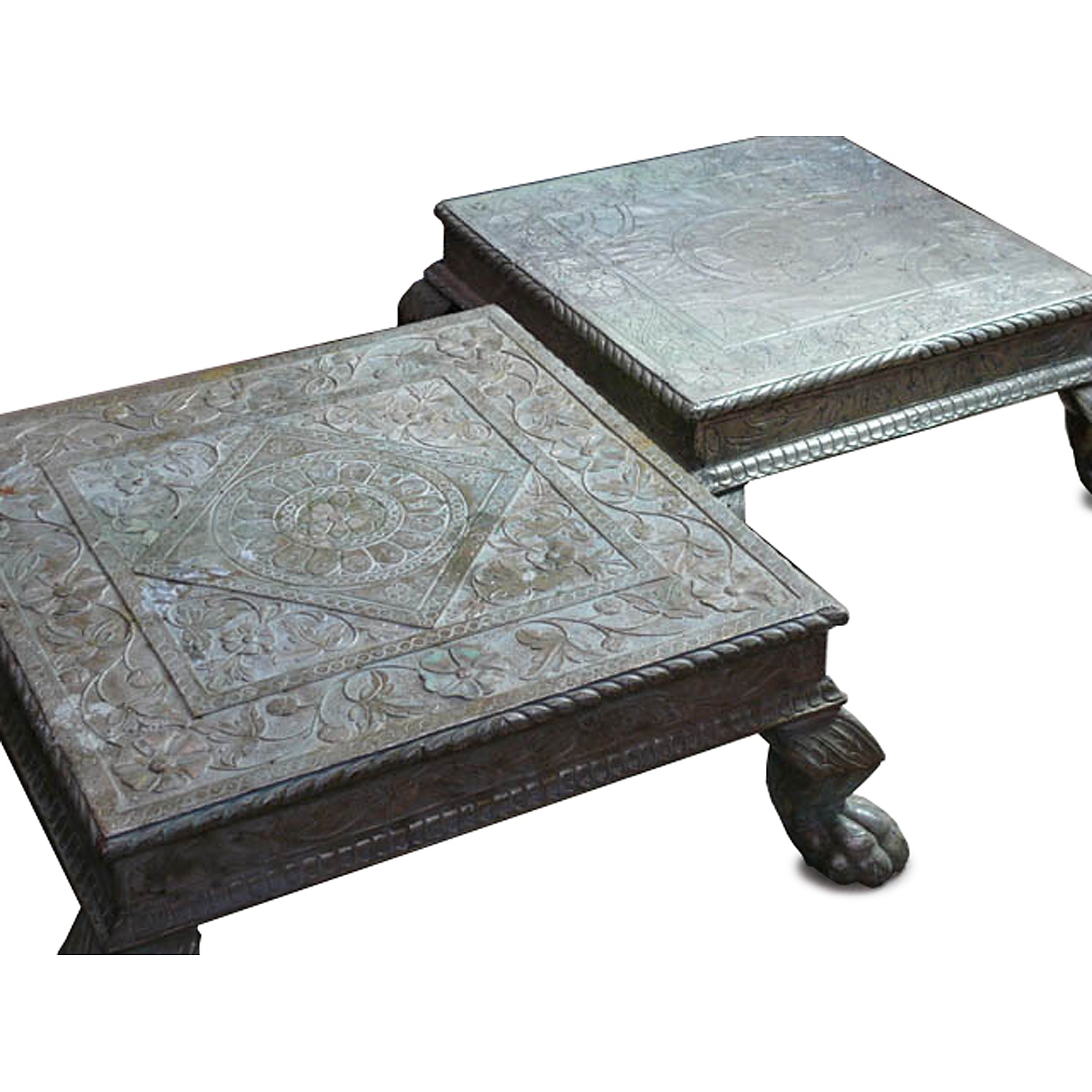 INDIAN EMBOSSED SILVER COVERED LOW TABLE ( USE WITH TABO10058 ) (X6) 1= 43 CM LONG 43 CM DEEP 24 CM HIGH 1= 53 CM LONG 53 CM DEEP 26 CM HIGH 1= 68 CM LONG 68 CM DEEP 27 CM HIGH
