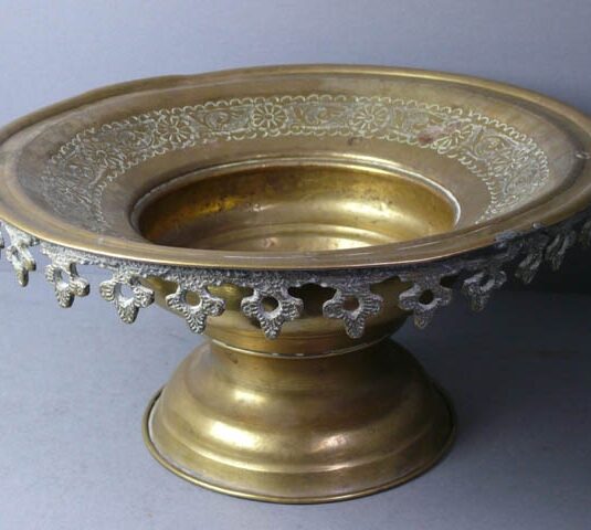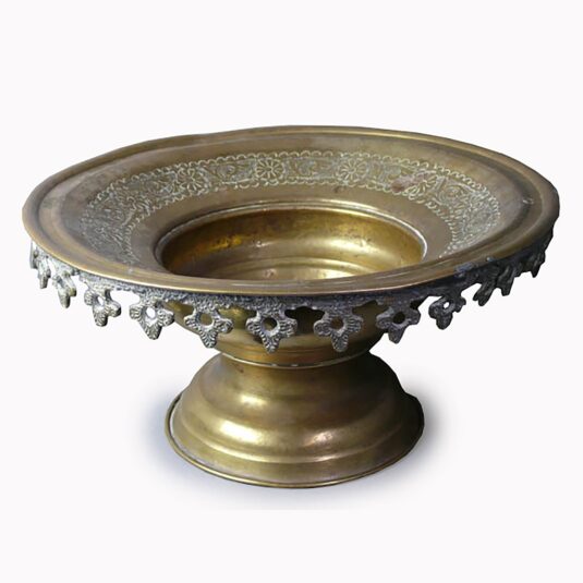 INDIAN ENGRAVED BRASS TAZZA / BOWL WITH HANGING FRIEZE EDGE (X2)