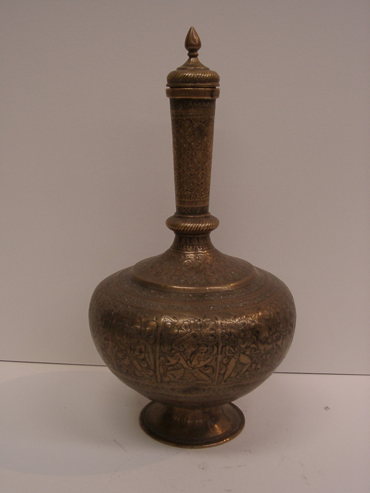 INDIAN ENGRAVED BRASS VASE VERY NARROW NECK 11/i HIGH (X4)