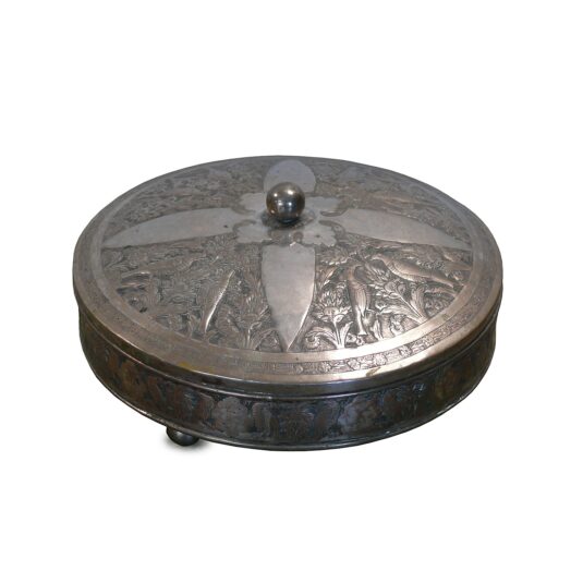 INDIAN SILVER PEACOCK PATTERNED BOX CIRCULAR SHALLOW WITH LID AND BUN FEET