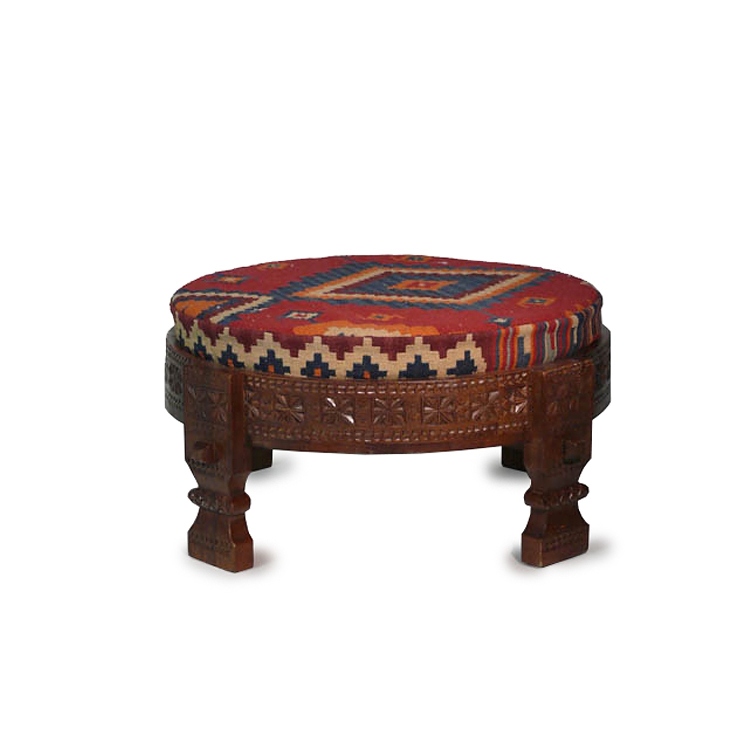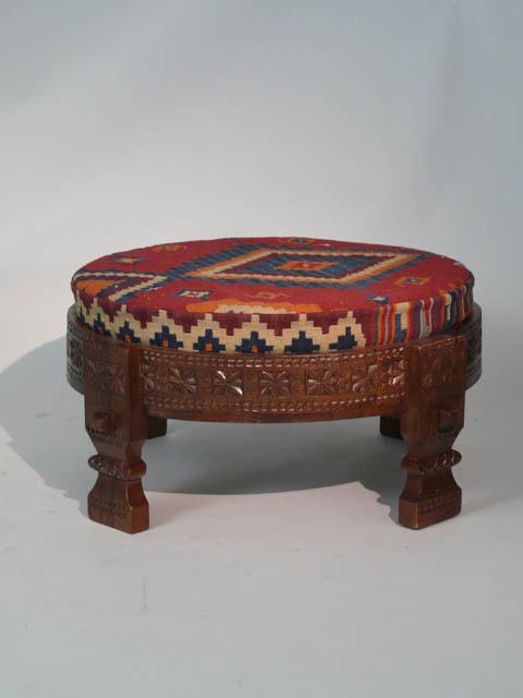 INDIAN SPICE TRAY STOOL CARVED CIRCULAR WITH FITTED DHURRIE CARPET CUSHION (X4)