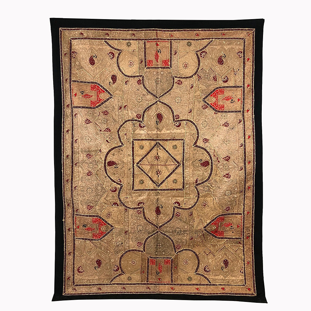 INDIAN TABLE CLOTH / THROW GOLD EMBROIDERED SILK WITH BLACK TRIM