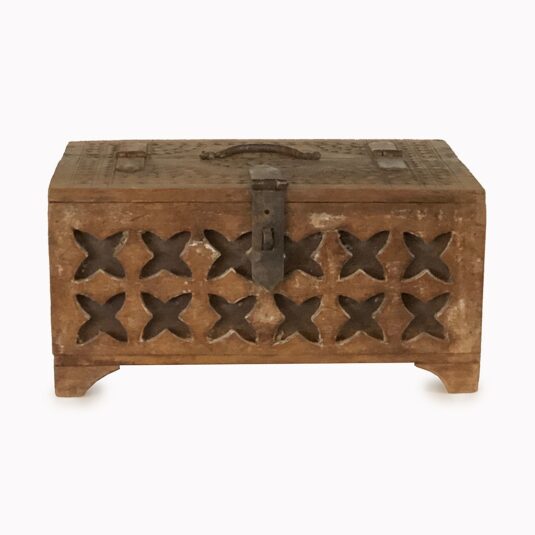 INDIAN WOOD BOX WITH FRETTED X PATTERN ON SQUARE FEET 18 CM HIGH 36 CM LONG 25 CM WIDE