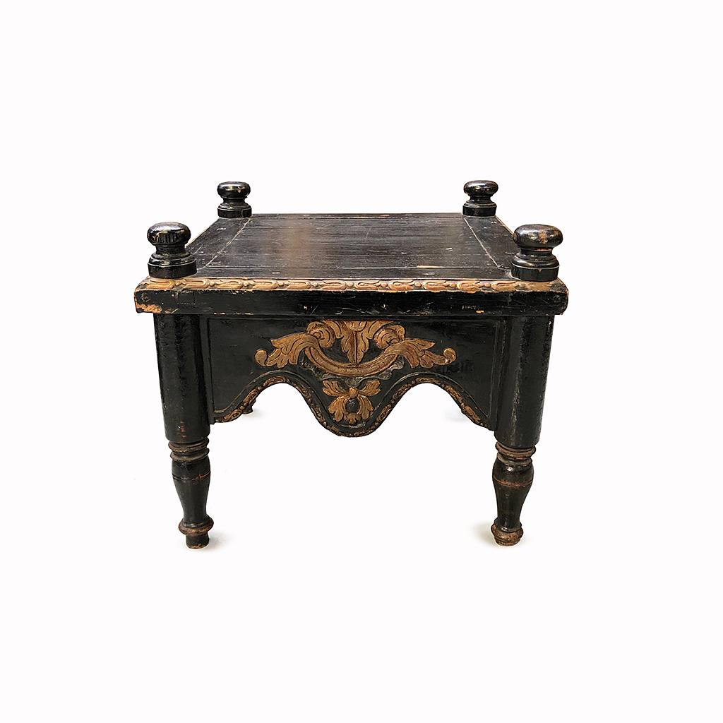 INDO PORTUGUESE CARVED GILDED AND EBONISED LOW TABLE / STAND WITH TURNED LEGS AND KNOB CORNERS 48 CM HIGH 65 CM WIDE 65 CM DEEP (X2)
