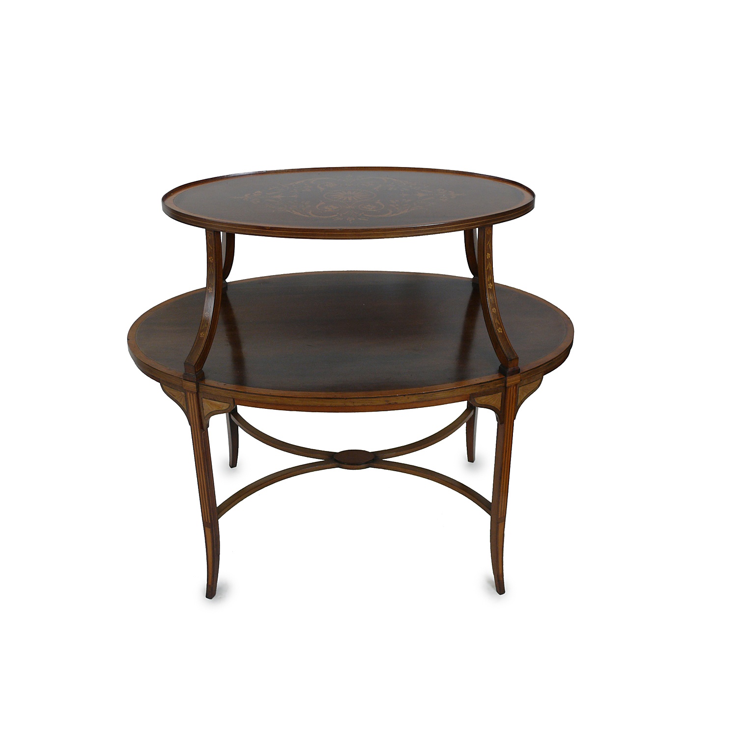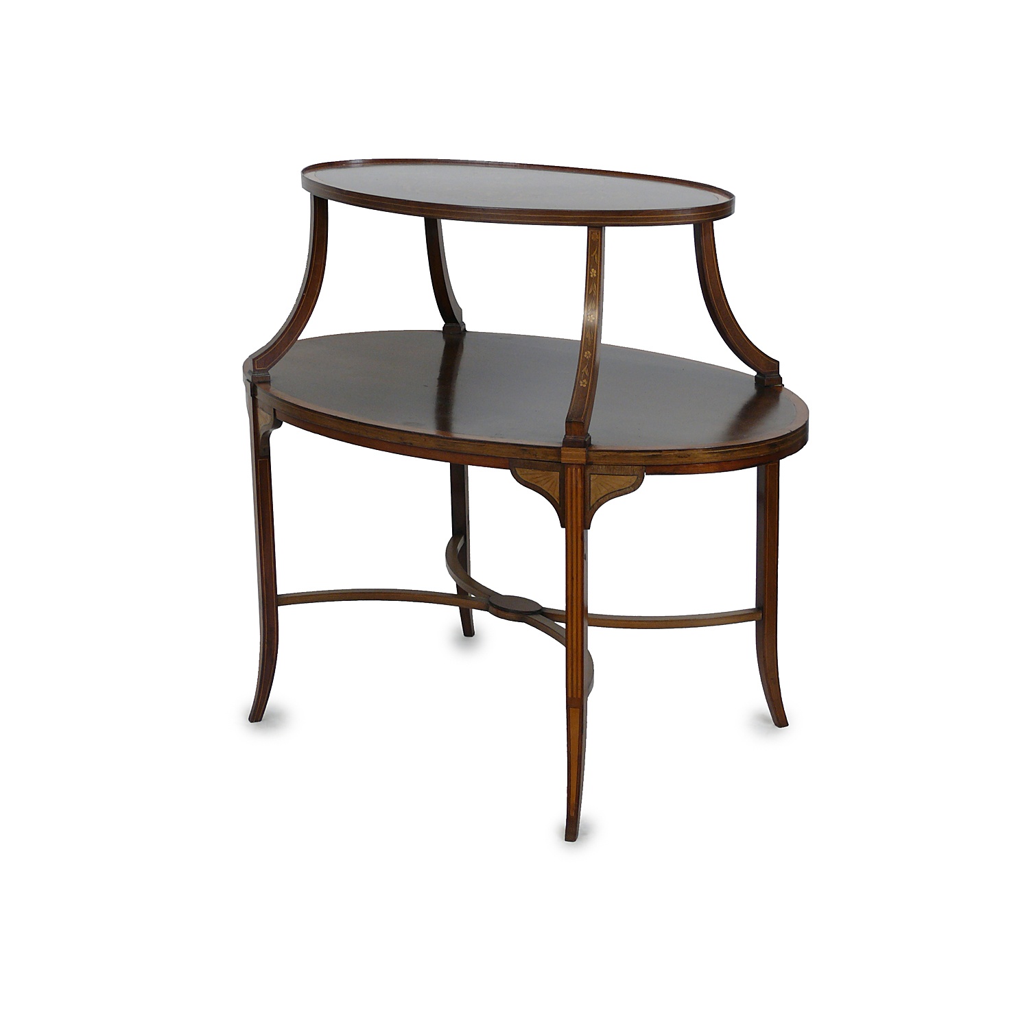 INLAID OVAL TWO TIER TEA TABLE EDWARDIAN LIGHT MAHOGANY WITH FRUITWOOD INLAID TOP 78 CM HIGH 89 CM WIDE 54 CM DEEP