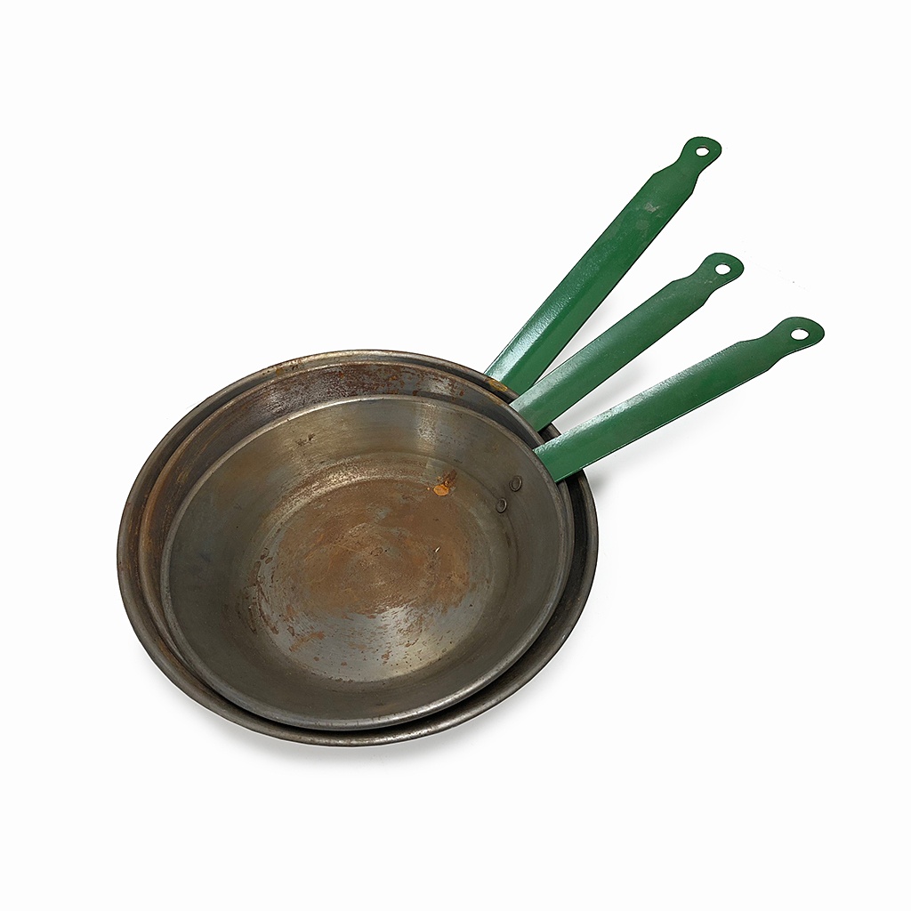 IRON FRYING PAN WITH A GREEN PAINTED HANDLE 19 CM - 23 CM DIAM (X3)