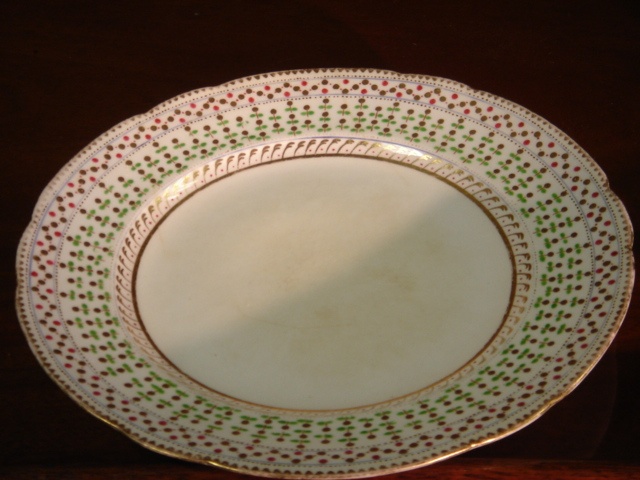 IRONSTONE WHITE AND GOLD DINNER PLATE DOT / CLOVER PAT.