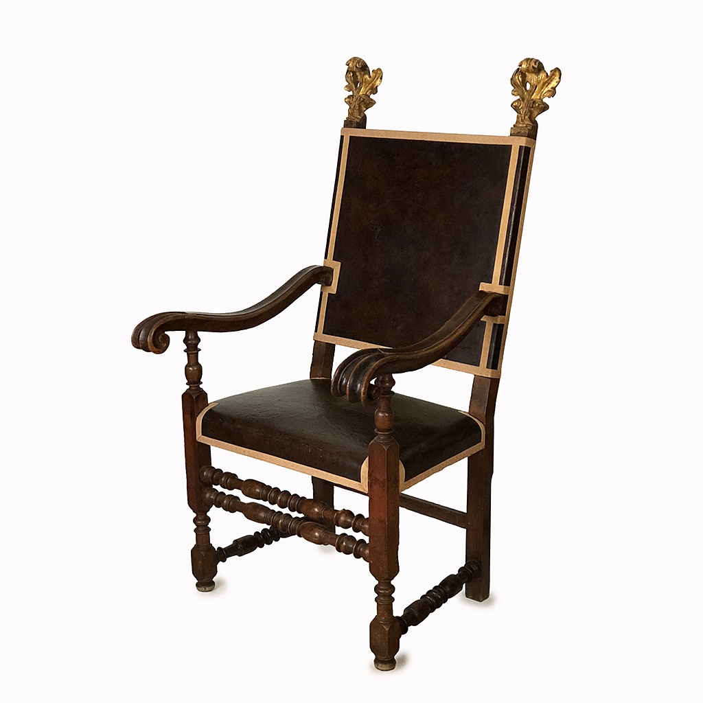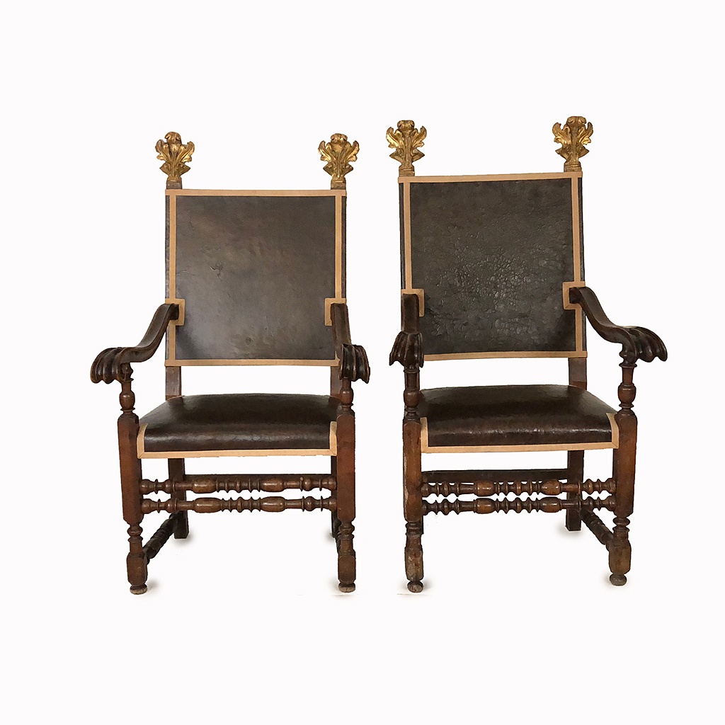 ITALIAN 17TH CENT THRONE ARM CHAIR BROWN LEATHER UPHOLSTERY WITH ORNATE GILDED FINIALS 136 CM HIGH 73 CM WIDE 70 CM DEEP (X2)