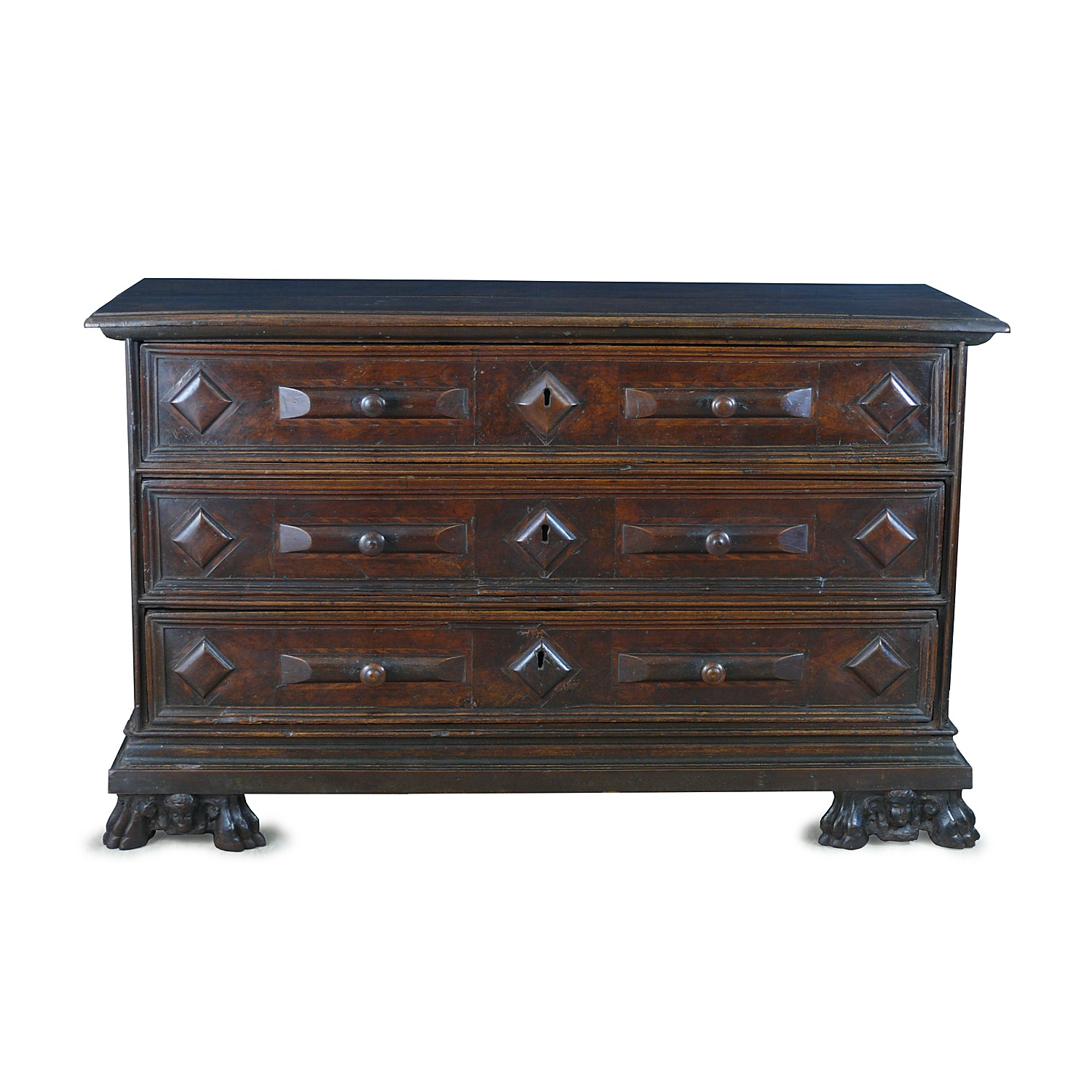 ITALIAN / BOLOGNA COMMODE CHEST OF DRAWERS WITH LION PAW AND CHERUB FEET DARK WALNUT EARLY 18TH CENT 88 CM HIGH 146 CM WIDE 55 CM DEEP