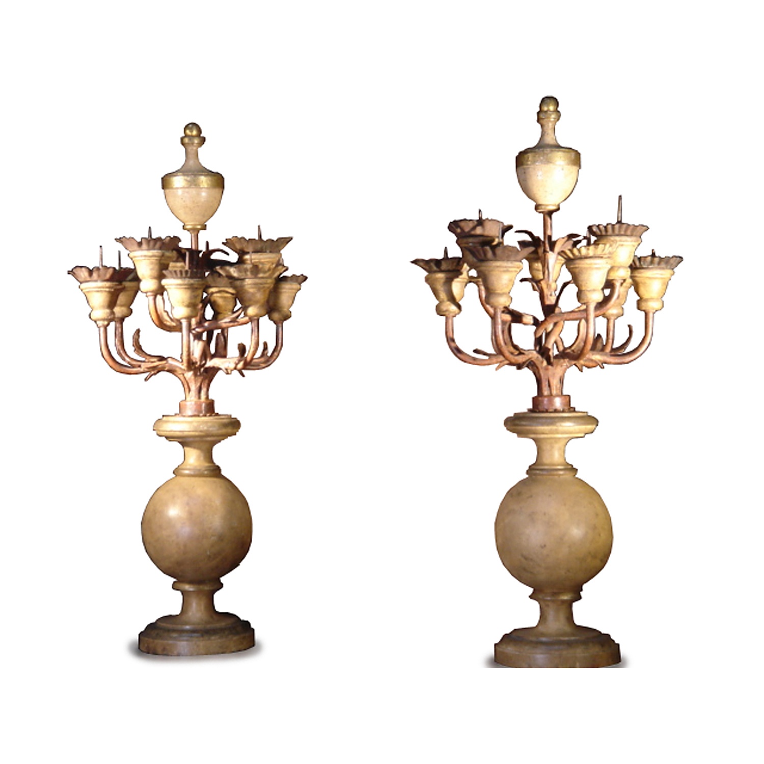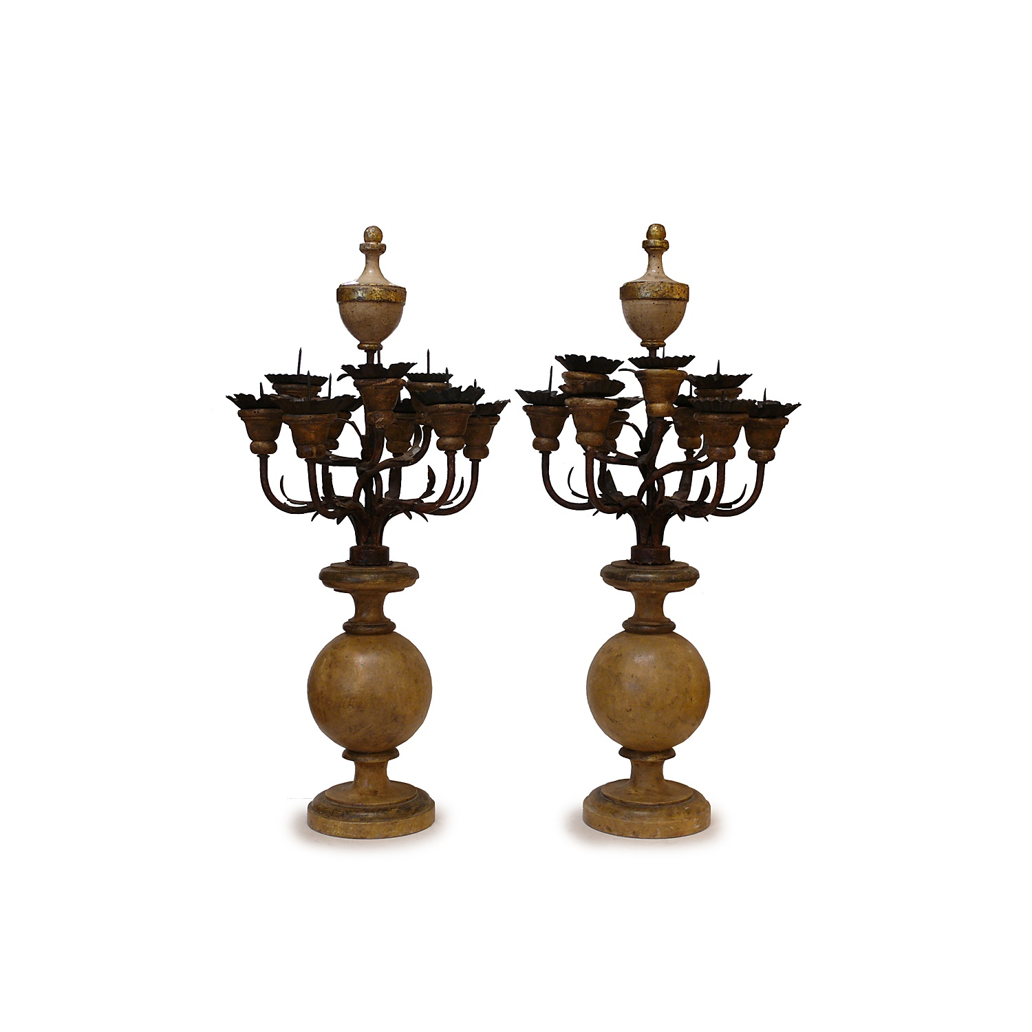 ITALIAN CANDELABRA PART 17TH CENT. WROUGHT IRON PRICKETS ON A PAINTED TURNED WOOD BASE NINE LIGHT 79 CM HIGH 36 CM WIDE (X2)